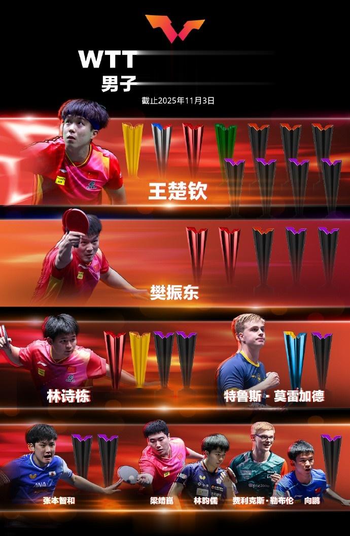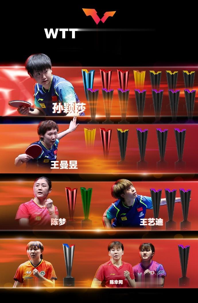 女单方面孙颖莎14次夺冠居首,王曼昱6次随后,王艺迪3次夺冠反超陈梦排名第三。
