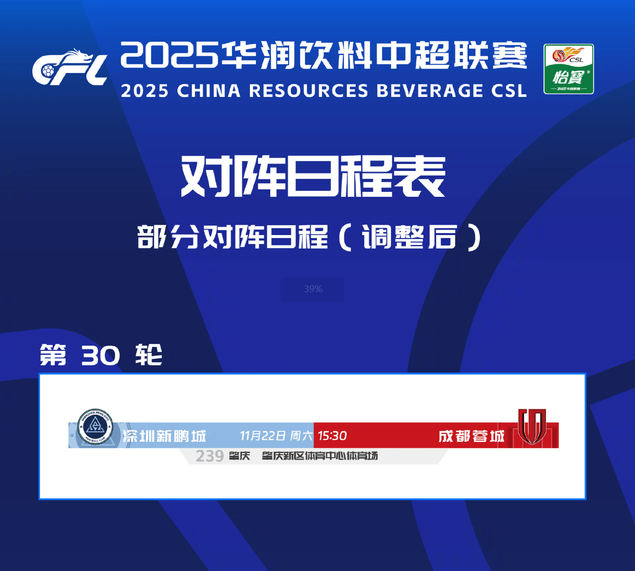 根据2025华润饮料中超联赛赛程,深圳新鹏城对阵成都蓉城的比赛将于11月22日15:30在深圳市体育中心体育场进行,由于深圳赛区举办全运会和残特奥会比赛,为保证本场比赛安全有序进行,经深圳新鹏城足球俱乐部申请,协商深圳赛区、成都蓉城足球俱乐部以及有关方面同意,现决定将深圳新鹏城对阵成都蓉城比赛进行调整,具体调整如下: