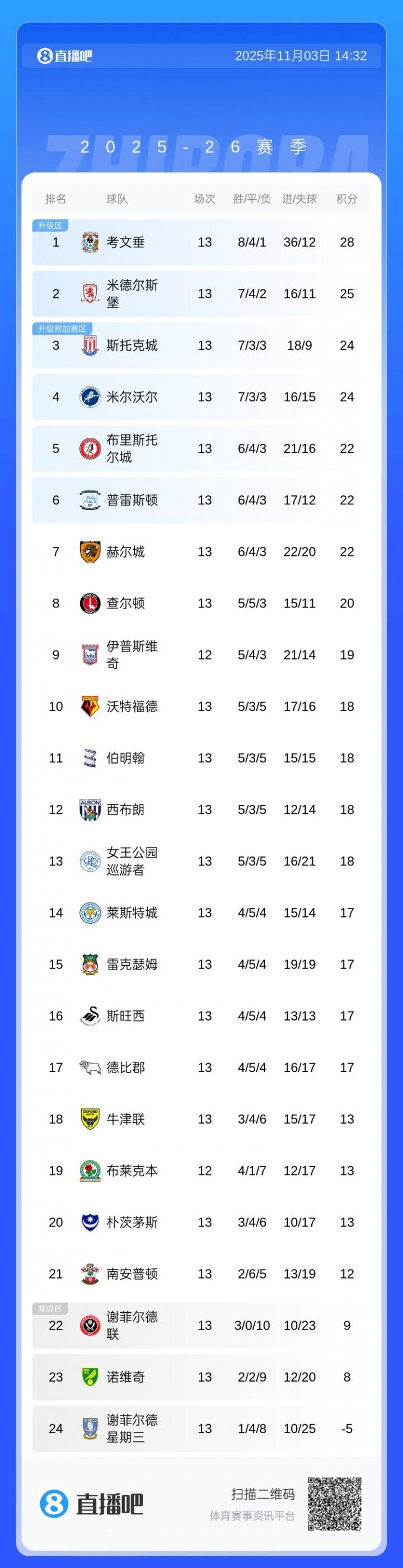 其他英冠球队方面,兰帕德执教的考文垂本轮吃到英冠赛季首败,但仍以3分优势领跑。垫底的谢周三离抹平12分的罚分还有一些距离,目前暂积-5分。