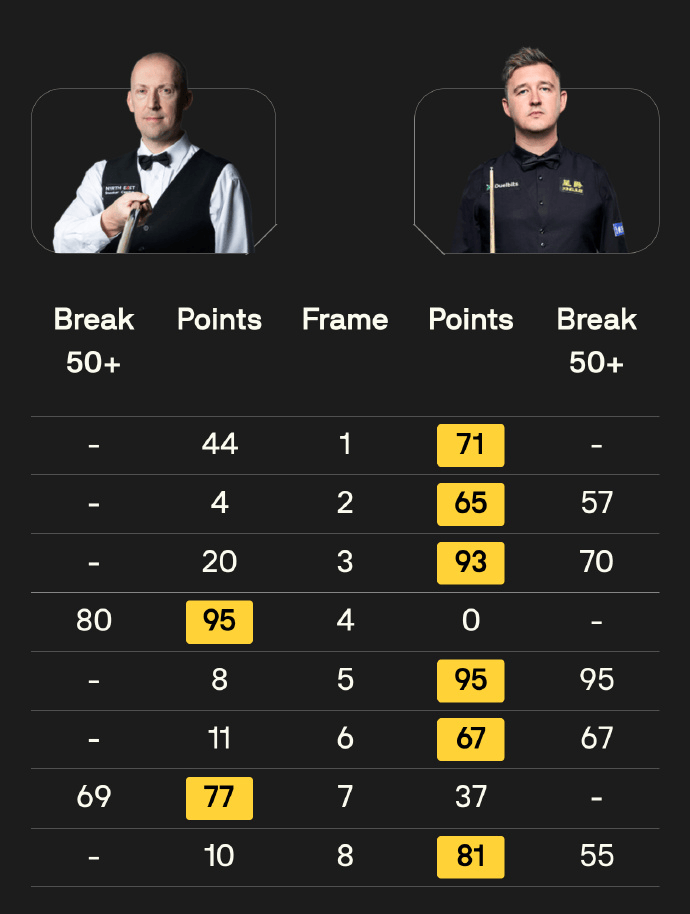 上半场威尔逊取得3-1领先;休息回来后他再赢两局先到赛点,利利扳回一城后,威尔逊单杆55分锁定胜利;全场比赛,威尔逊打出5杆50+(57、70、95、67、55分),利利打出两杆50+。