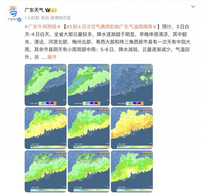 据广东天气消息,预计3日白天-4日白天,全省大部云量较多,降水逐渐趋于明显,早晚体感清凉,其中韶关、清远、河源北部、梅州北部、粤西大部和珠三角西部市县阴天有中到大雨,其余市县阴天有小雨局部中雨;5-6日,降水减弱,云量逐渐减少,气温回升。