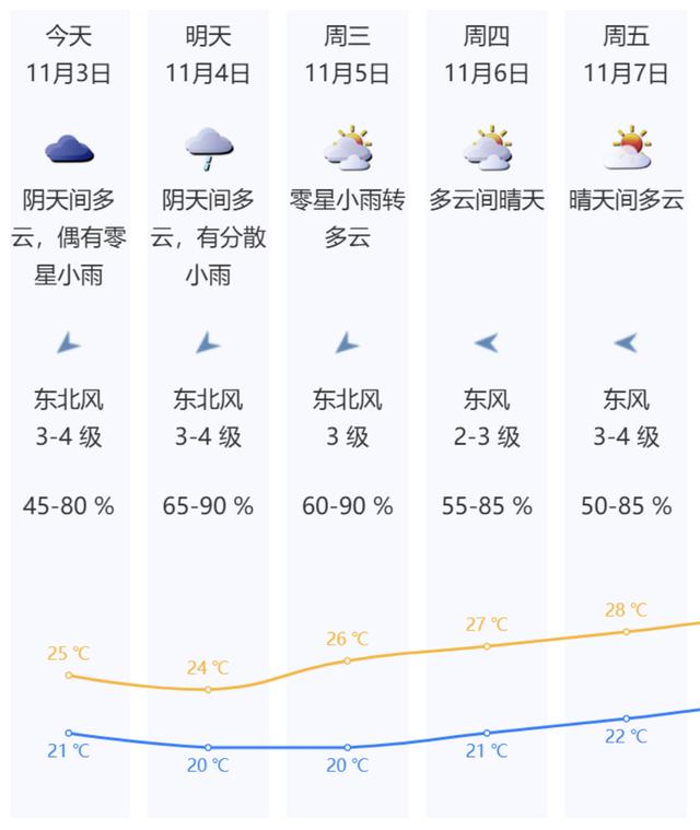 11月5日,全省大部小雨转多云间阴天。最低气温:南部沿海市县18-21℃,粤北偏北市县12-15℃,其余市县16-18℃。