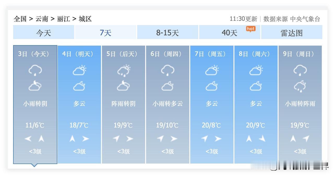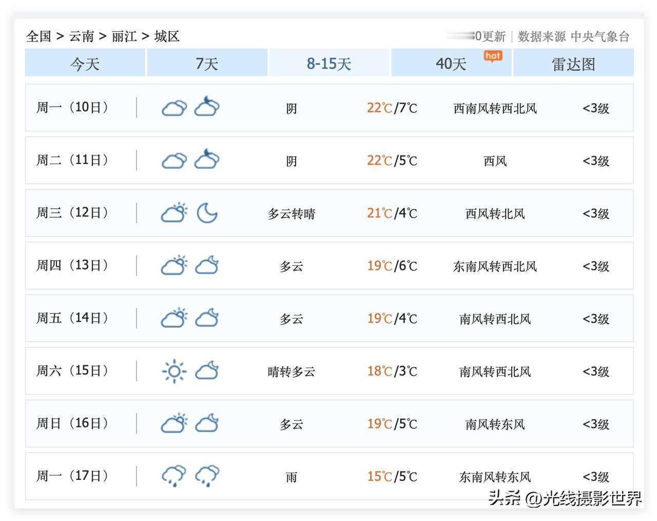 噢!看了看11月8日到17日的云南昆明的天气预报……昆明植物园的秋色最浓的时候……可能天气不是那么美好啊!哎!这鬼天气啊! 重庆,接下来,几乎每天都要下雨……想要逃离重庆主城区啊! 噢,对了,最近,丽江的玉龙雪山,最近满血复活了没有?!在丽江古城或者黑龙潭,能够看到满血复活的玉龙雪山嘛?1