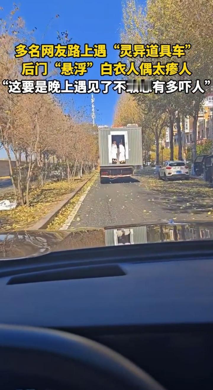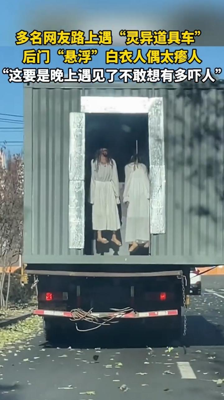 近日黑龙江哈尔滨,一36岁女子开车在路上,突然,看见前方的货车车厢后面竟然吊着几个白衣人,开近一看被瘆得慌! 女子开车追上去靠近一看,才发现原来后面车厢里都是些“灵异道具人”,但是十分逼真啊,一个个还穿着白衣服,这还好是大白天啊,要是大晚上的看见了,不得吓个半死啊,这么瘆人的道具,不能把车厢门关起来吗?好歹考虑下路人的感受啊!胆子小的人可能真会被吓到,尤其是晚上的时候!