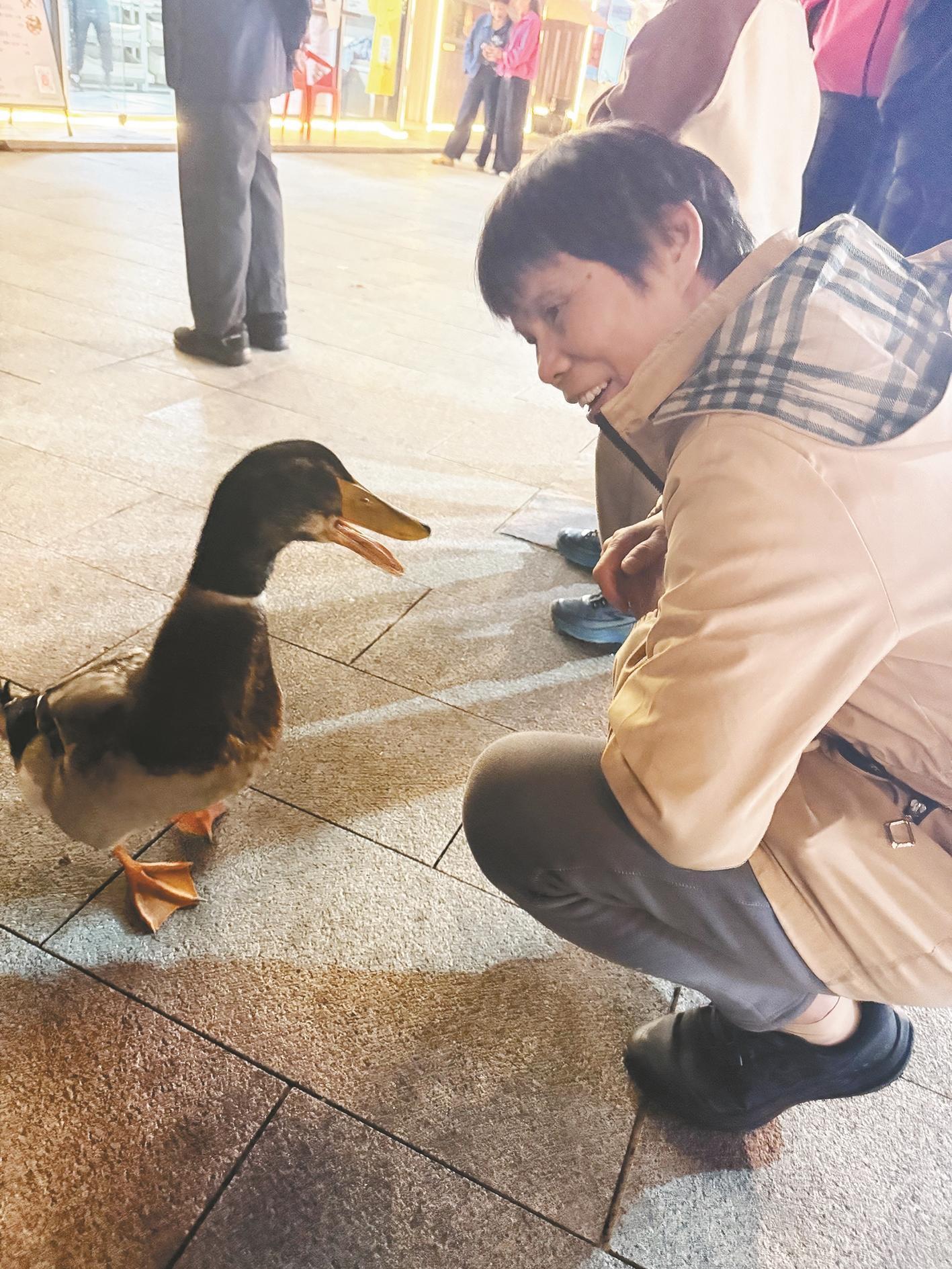 “我经常看见这只小鸭子,遛鸭画面特别温馨,让我想起小时候自己也养过鸭子。像小鸡、小鸭这类家禽,其实很聪明。”市民吴阿姨说。