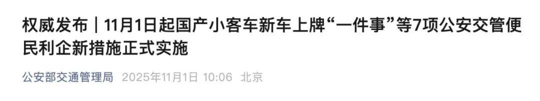 公安部交通管理局11月1日消息,公安部持续深化公安行政管理服务改革,自11月1日起在全国全面推行国产小客车新车上牌“一件事”,同时推出6项公安交管“一网通办”服务新措施,进一步提升公安交管服务质效,更好服务群众美好出行,助力高质量发展。