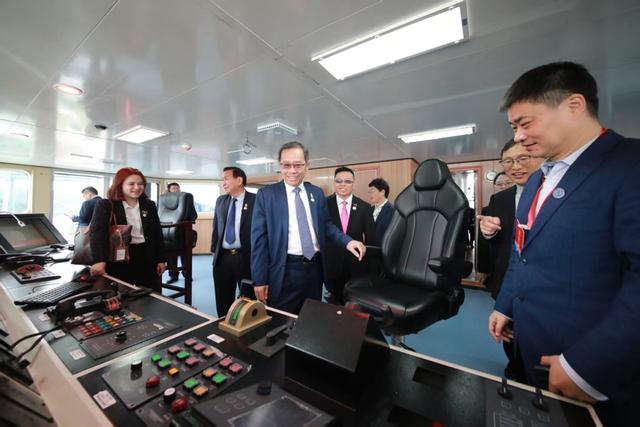 在宏盛造船厂码头,考察团成员登上中国民间远洋医疗救援船,沿着医疗区、救援物资区、驾驶舱室等功能区域逐一参观。该船排水量达5000吨,总长100.15米、型宽18米,可搭载船员、医疗、救援及志愿者50人,同时配备了检验、X光、B超、CT、手术室等医疗舱室和设施,搭载了各种救援装备、千余吨救灾物资及直升机平台这些硬核装备,展现了临海民营企业在高端装备制造领域的技术硬实力。