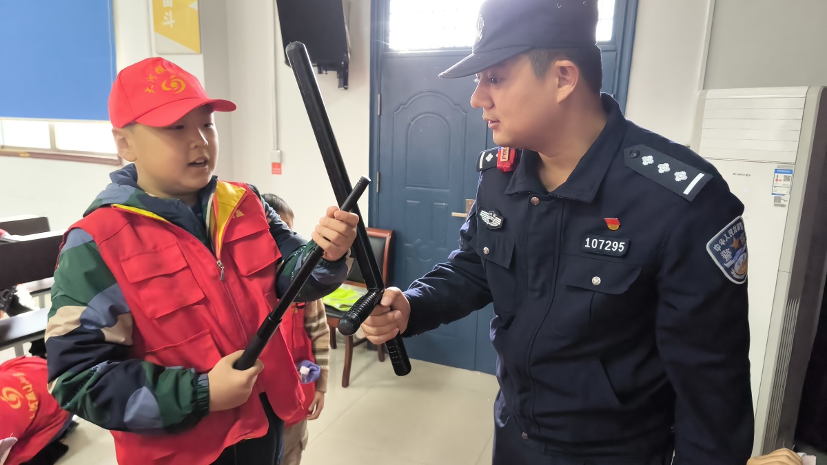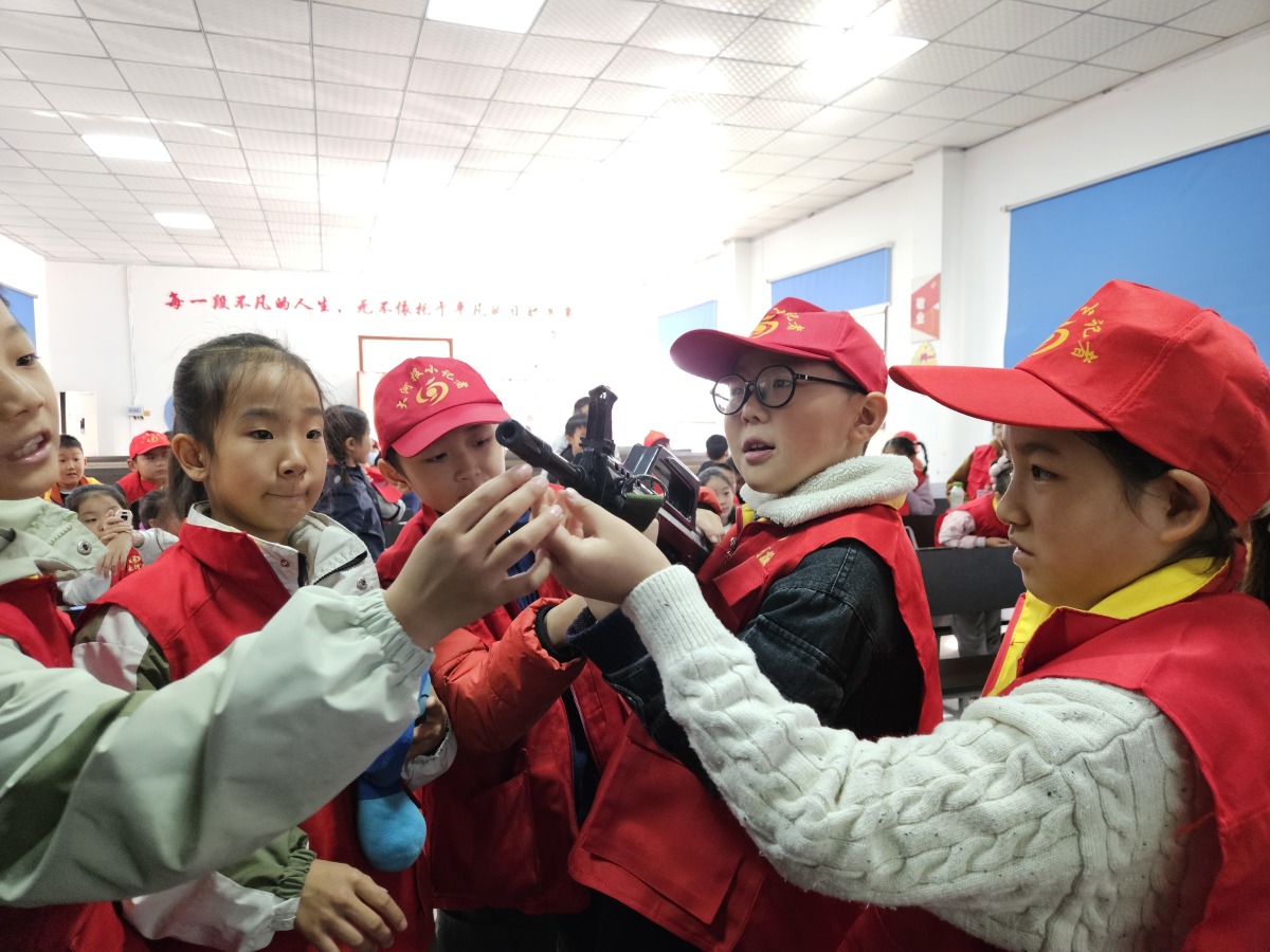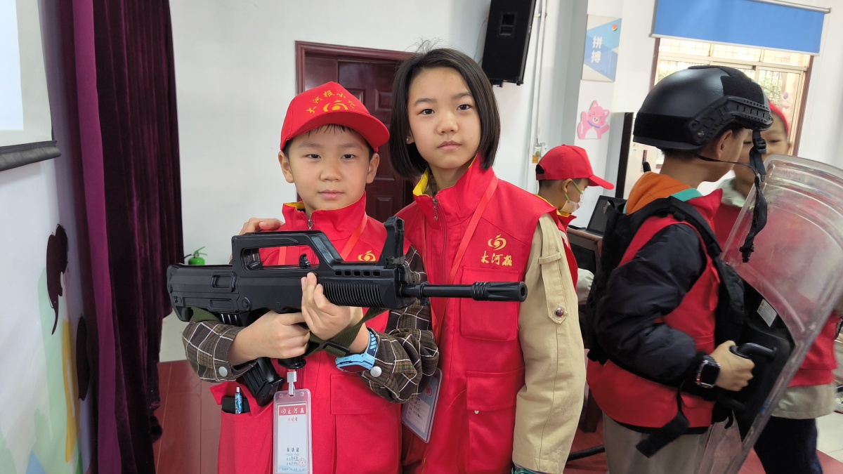 理论知识讲解结束后,活动进入备受期待的装备体验环节。特警队员宋少博逐一展示了执勤头盔、警棍、手铐、催泪喷射器等专业装备,并详细介绍了各类装备的用途及操作规范。“这套防刺服重达8斤,穿上它能有效抵御刀具袭击。”当特警队员将沉甸甸的防刺服披在小记者身上时,孩子们切实感受到了特警日常执勤的艰辛与责任。在特警的指导下,小记者们还亲手触摸了仿真枪械模型,体验了站姿射击的标准动作,过了一把“特警瘾”,现场欢呼声与惊叹声不绝于耳。