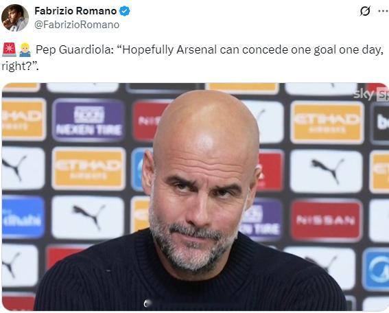 瓜迪奥拉说出了他的想法:希望阿森纳总有一天能失掉一球,对吧?[允悲][允悲][允
