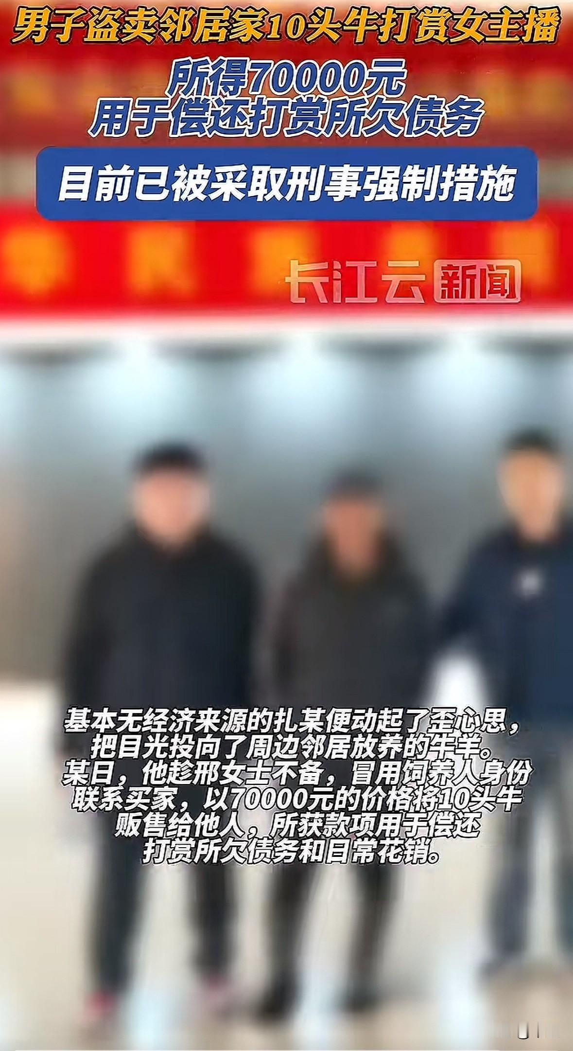 今年8月,内蒙古呼伦贝尔邢女士放养的10头牛被盗。民警查明,嫌疑人是邻居扎某。扎某沉迷短视频,为博取女主播关注,借钱刷礼物、充灯牌,负债后没了经济来源。他趁邢女士不备,冒用饲养人身份把10头牛卖了7万元,钱全用来还债和日常花销。现在扎某因涉嫌盗窃罪被采取刑事强制措施,案件还在侦办。 虚拟直播间的关注根本不实在,为了这点虚荣心违法犯罪太不值。邻居的牛是辛苦财产,偷卖造成的损失难挽回。打赏本来是娱乐,得量力而行,没能力就别硬撑。法律底线不能碰,不管什么理由,盗窃都要受严惩。大家看直播别被冲昏头,踏实过日子、合法赚钱才靠谱。