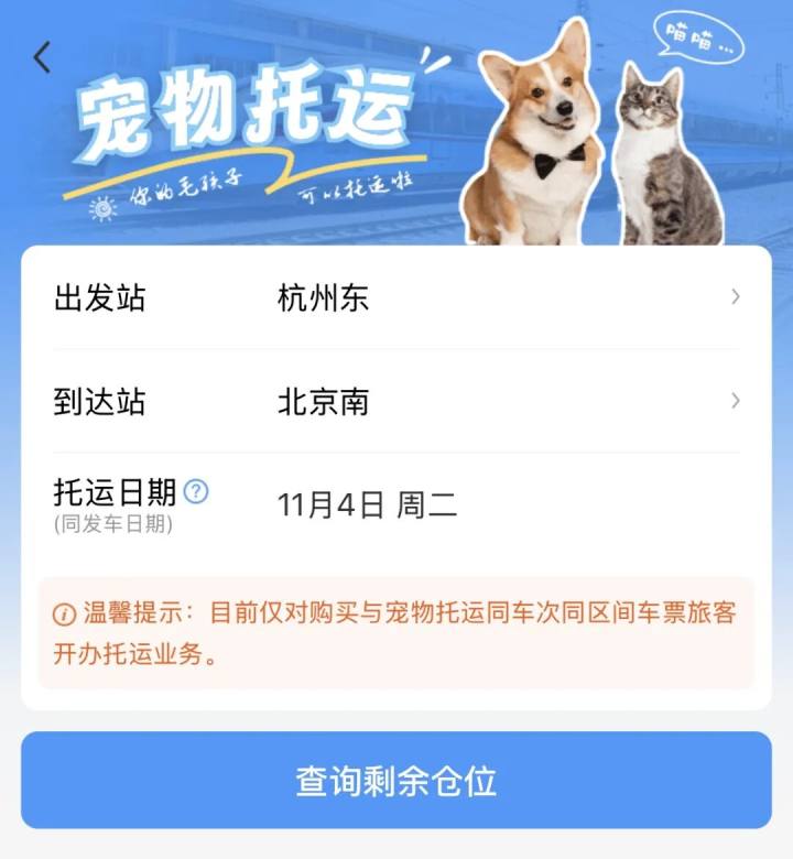 购票页面在相应车次旁标注“宠”字。旅客本人购票成功后,页面会自动显示“宠物托运”入口;