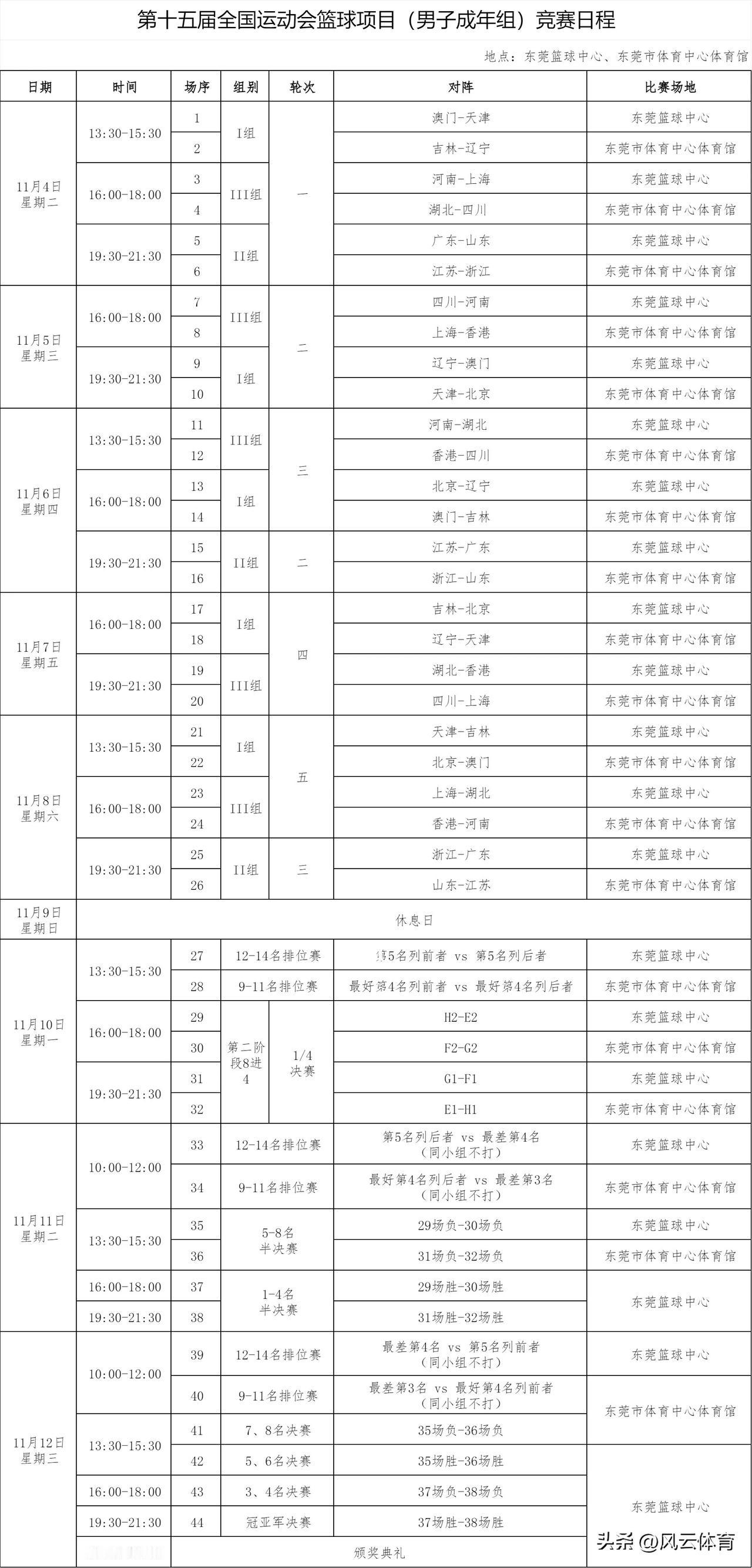 赵睿、周琦领衔!2025全运会成年组男篮明日开赛! 据全运会官方消息,第15届全运会成年组男篮的比赛将于明天正式开打,来自广东、四川、辽宁、北京、天津、吉林、浙江、山东、江苏、澳门、上海、河南、湖北、香港等14支球队将在东莞篮球中心和东莞市体育中心体育馆进行角逐。 具体分组如下: I组:辽宁、天津、北京、澳门、吉林; Ⅱ组:浙江、山东、江苏、广东; Ⅲ组:四川、上海、香港、河南、湖北。 根据赛程安排,第一阶段是小组单循环赛,各组前2名及成绩最好的2个第3名晋级八强。第二阶段则是八强球队通过交叉淘汰赛决出冠军。 目前各支球队名单已经出炉,东道主广东拥有赵睿、胡明轩、周鹏等多名国手压阵,势必要在家门夺冠。而四川男篮坐拥周琦、胡金秋两大国字号内线双塔,加上孙铭徽、赵岩昊等实习悍将,他们同样具备夺冠实力。而辽宁男篮本次召回了已经退役的韩德君,加上神射手原帅和抢断王高诗岩的回归,让这支辽篮实力大增,他们也跻身争冠行列。 全运会 广东宏远