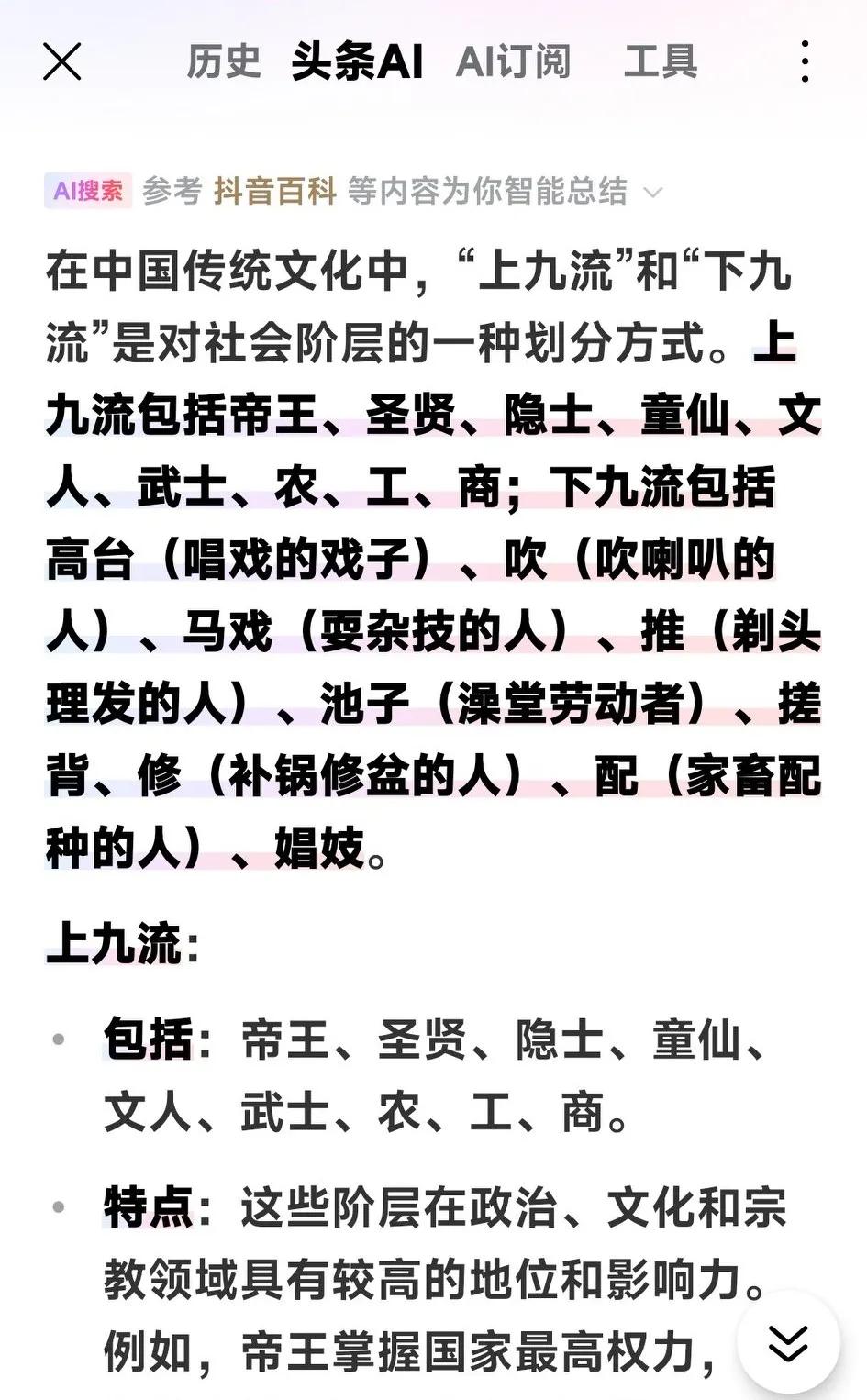 很多人不知“商人”原来是上九流[震惊][呲牙] 很多人看红楼梦,因为不喜薛宝钗,连带把她一家人都骂上了,口水都要喷死她…下面👇🏻这个“恨钗党”竟然由于痛恨她而骂她家“即使是皇家采办也是下九流……”我看得不气反笑了,那么商人到底是不是下九流呢?我们来看看资料——👇🏻👇🏻👇🏻 在中国传统文化中,“上九流”和“下九流”是对社会阶层的一种划分方式。 上九流 包括: 帝王、圣贤、隐士、修仙人、 文人、武士、农、工、商。 ● 地位: 被视为社会的上层,受到广泛的尊重和认可。 ● 特点: 这些阶层在政治、文化和宗教领域具有较高的地位和影响力。例如,帝王掌握国家最高权力,宰相负责处理国家大事,而举人、进士等则是通过科举考试选拔的人才,具有较高的声望。 下九流 包括: 高台(唱戏的戏子)、 吹奏(红白喜事吹奏的人)、马戏(耍杂技的人)、 推子(剃头理发的人)、 池子(北方澡堂的搓背人)、修补(补锅修盆的人)、 配种(给家畜配种的人)、 娼妓(这个人人都明白)。 ● 地位:处于社会的底层,受到社会主流的排斥。 ● 特点:这些职业被认为地位低下,可能是因为工作性质或社会观念的影响。例如,娼妓的工作被视为道德败坏,而戏子等从事表演的职业在封建社会中也不受重视。 随着社会的发展,现代社会对职业的看法已经发生了变化,更加重视个人的能力和价值,而不是职业的传统地位。 因此,“上九流”和“下九流”的概念在现代社会中已经不再适用。 由此可见,商人是上九流而非下九流! 对于传统文化,我们还是要好好学习继承才行,如果不懂就不要随便出口贻笑大方,一定要对自己没把握的知识先查资料再来评说!!!