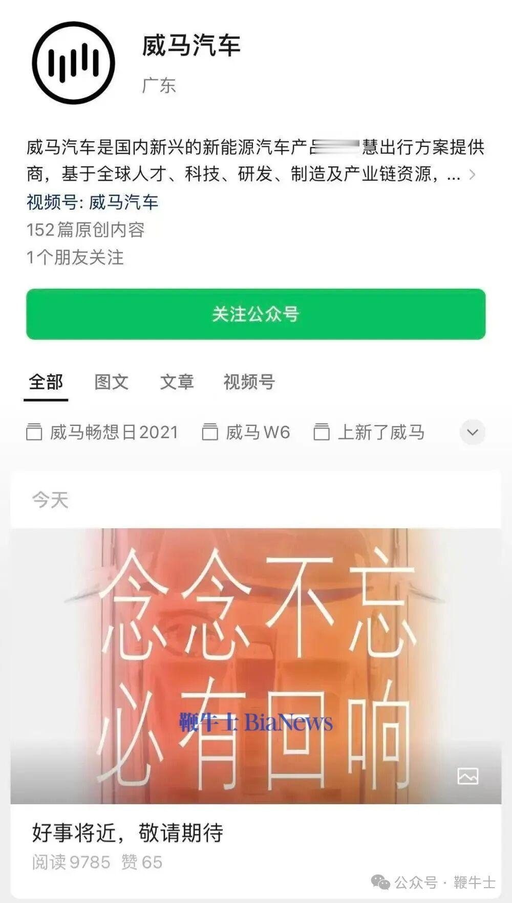威马汽车今日发文“好事将近,敬请期待”,配图上写有“念念不忘,必有回响”。