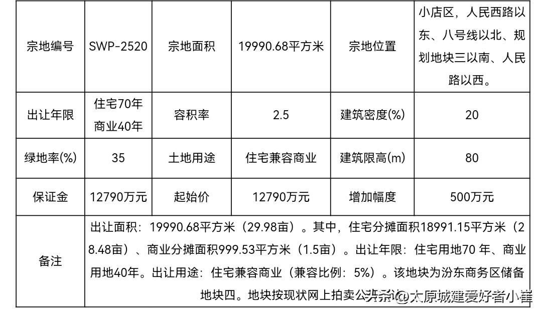 2025.11.3【太原市汾东商务区储备地块(swp-2520地块)】太原市汾东商务区储备地块四(swp-2520地块),该地块位于小店区,人民西路以东、八号线以北、规划地块三以南、人民路以西 ;出让面积:19990.68平方米(29.98亩); 土地用途:普通商品住房用地,住宅兼容商业(兼容比例:5%) ;规划容积率:2.5 ;规划建筑密度:20% ;建筑限高: 80米;绿地率:35% 。