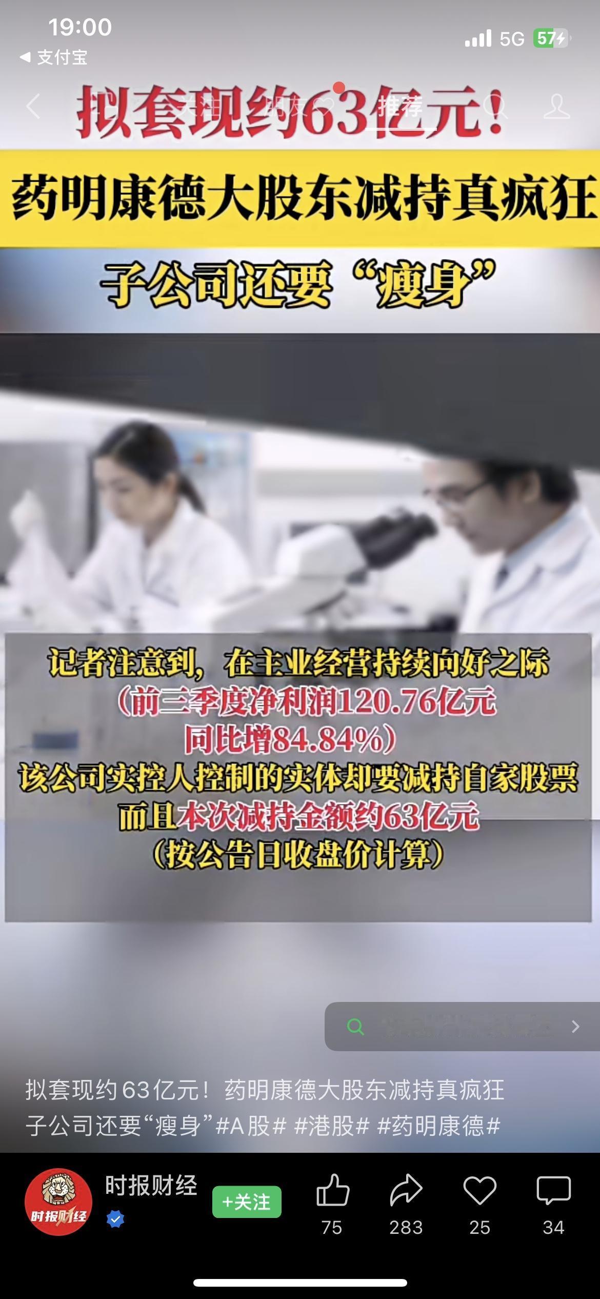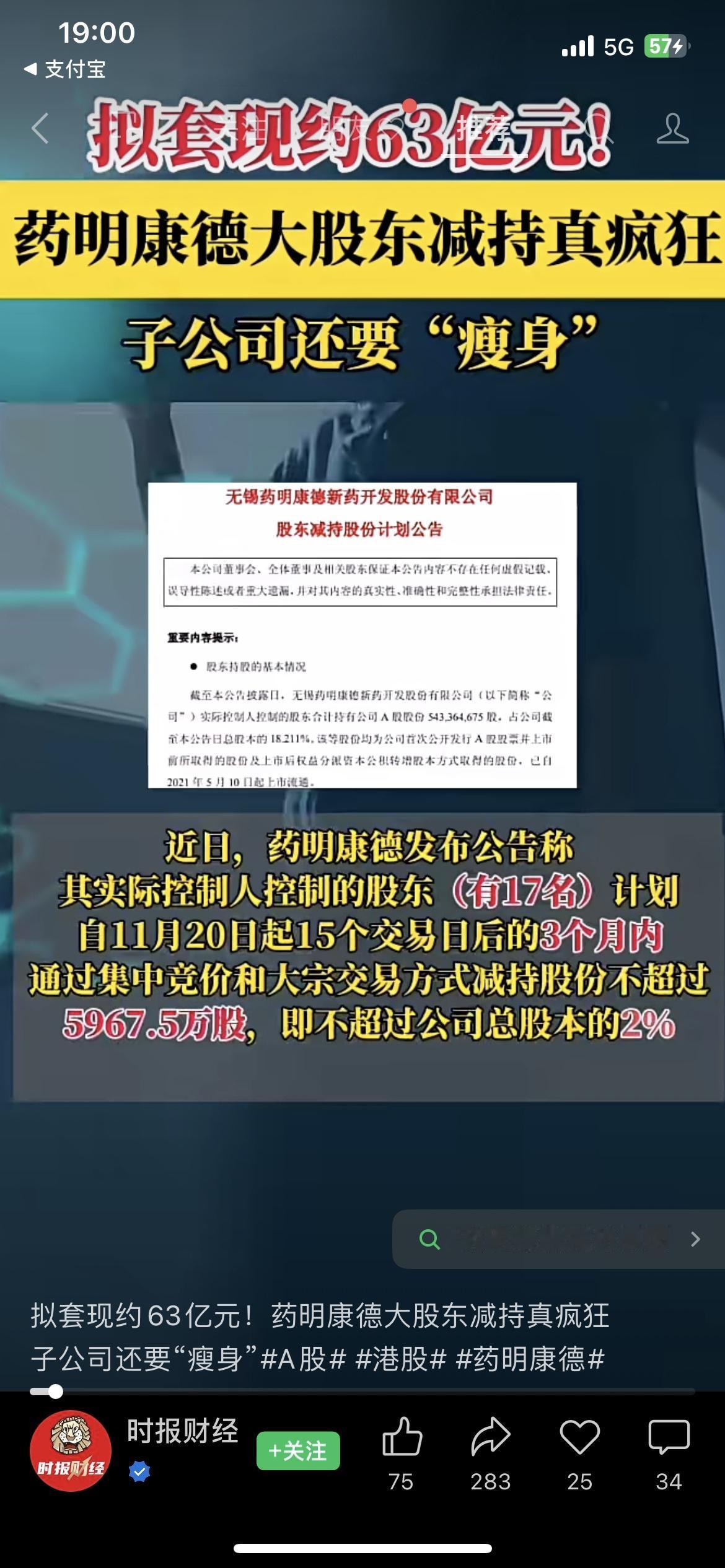 太疯了!药明康德股东又套现63亿 明药康德 刚刷到个离谱事儿!药明康德大股东又要减持,这次直接套63亿!这公司打上市起都减持52回了,加起来卷走363亿——合着主业越赚,股东跑越快?这操作真把散户当“接盘侠”啊? 你们要是拿这股,现在是割肉还是硬扛?这股东到底想干啥? 持股的朋友盯紧走势!转发给炒股的兄弟,这波得小心踩坑!