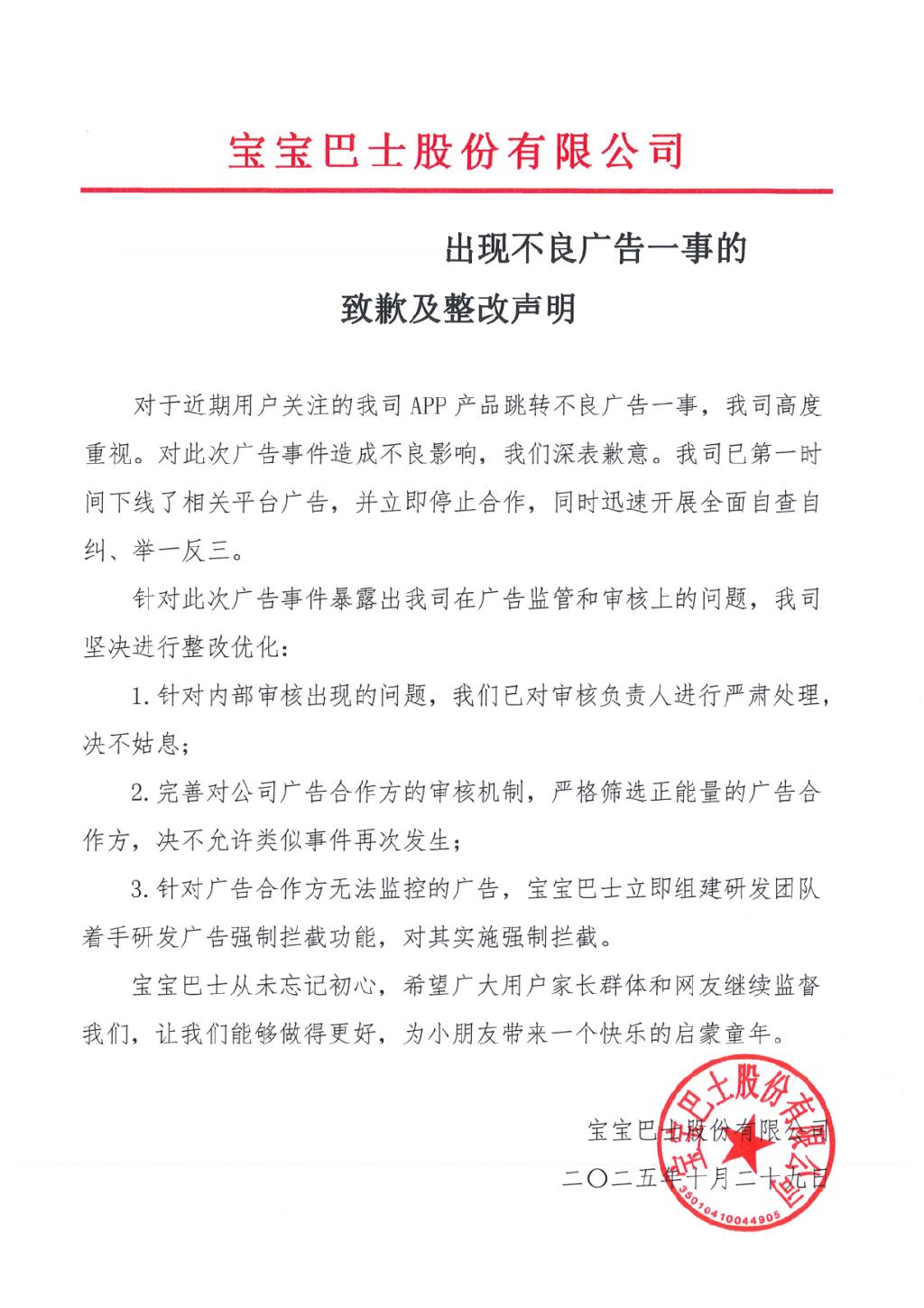 关于出现不良广告一事,宝宝巴士客服称,非会员会展示第三方广告且平台会审核,但审核或有疏漏,低俗广告属“异常情况”,将反馈技术部门排查。宝宝巴士公司还发声明称,对App跳转不良广告高度重视并致歉,已下线相关广告、停止合作,且开展全面自查自纠。