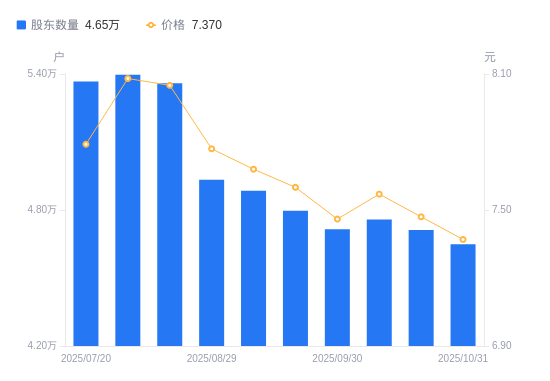 日期A股户数(户)流通A股户均持股数(股)户均持股市值(万元)2025-10-314649311367.808.382025-10-204712011216.548.382025-10-104758611106.698.412025-09-304715211208.928.362025-09-194796611018.708.372025-09-104884810819.758.312025-08-294933410713.168.322025-08-08535949861.617.942025-07-31539729792.547.912025-07-20536679848.207.67