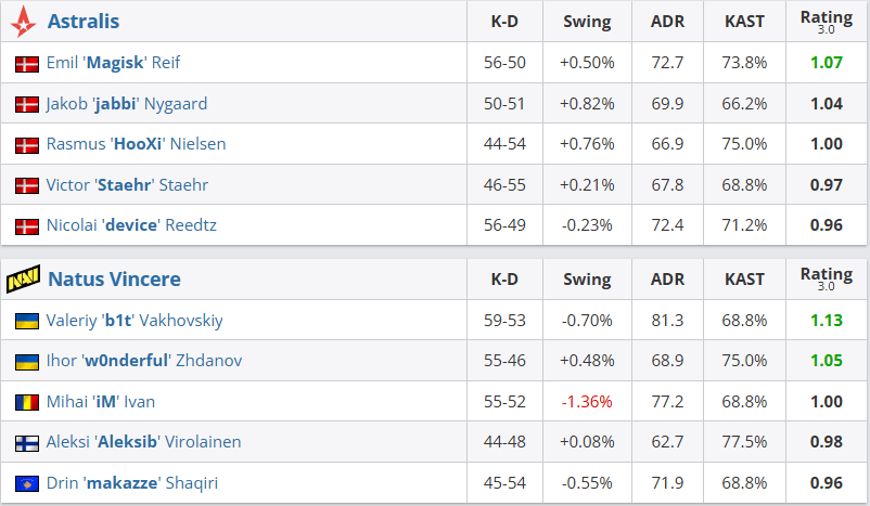 决胜图Inferno,两队更打得不可开交,多名选手轮流发挥,上下半场均战成6-6平,NAVI连追两个赛点再次将比赛拖入加时,但加时赛,Astralis连下四分,以16-12终结比赛,艰难赢下首胜。
