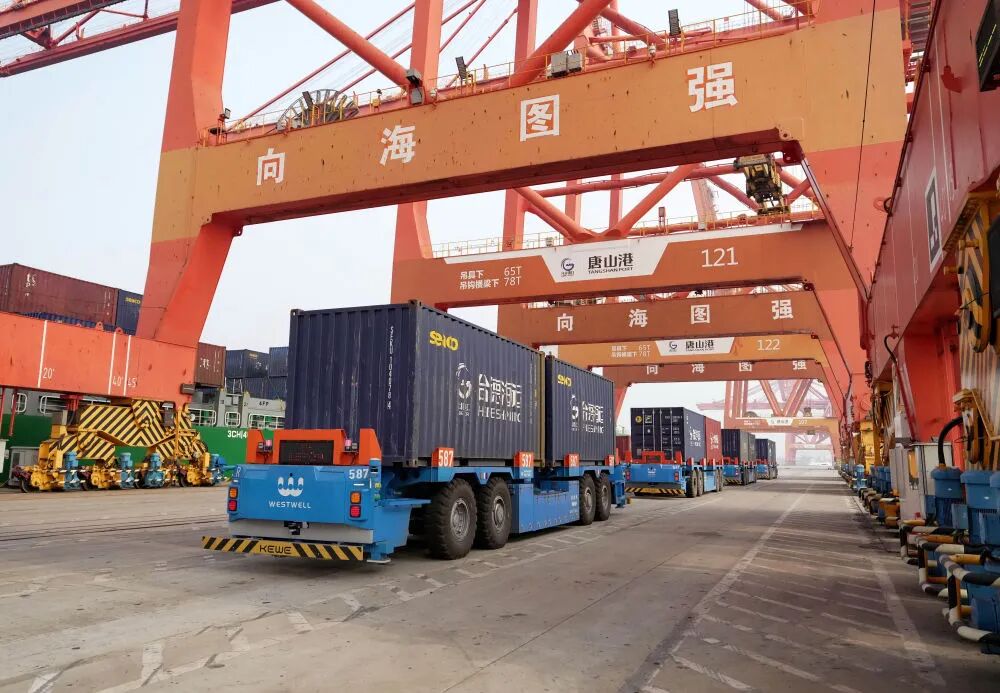 ↑10月29日,唐山港京唐港区的无人运输车在集装箱码头作业。