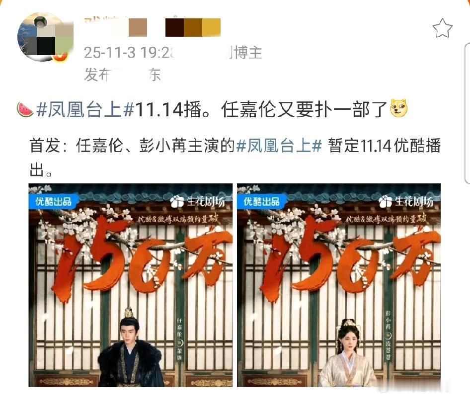都还没播就唱衰?过分了吧! 今日,有瓜主称任嘉伦与彭小苒领衔主演的权谋虐恋剧《凤凰台上》即将(11月14日)上线开播,确实让人挺激动的! 要知道男女主都是BE天花板存在,一个周生辰,一个小枫,曾虐哭无数人。现如今两人合体开虐,高低得尝尝咸淡。 不过《凤凰台上》作为任嘉伦离瑞礼,很多网友都不看好。如果开播,你会追吗?