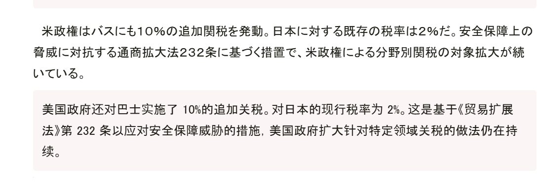 🔻美国政府还对巴士实施了 10%的追加关税,对日本的现行税率为 2%。