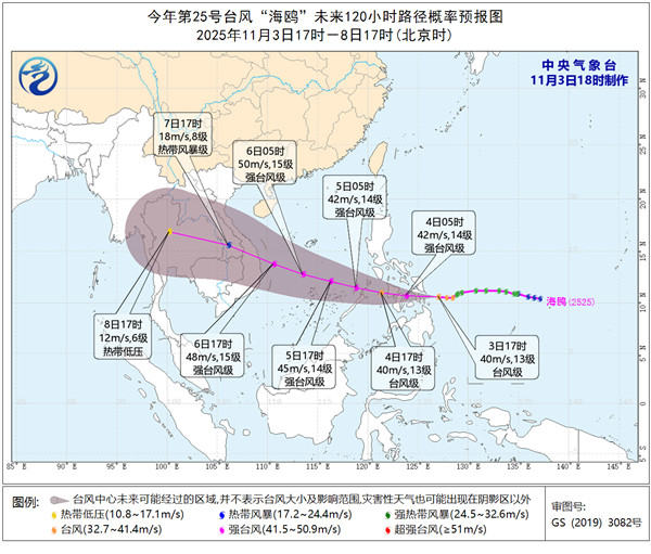 今年第25号台风“海鸥”仍在发展中,今天夜间到明天凌晨登陆菲律宾中部沿海(台风级或强台风级,40-45米/秒,13-14级),以后穿过菲律宾中部,将于5日早晨移入南海东南部海面,强度将继续加强,最强可达强台风级(45-50米/秒,14-15级),6日夜间逐渐趋向于越南中部沿海。