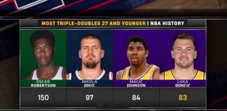 【东契奇未超27岁揽83次三双 历史第4&仅次于大O&约基奇&魔术师!】