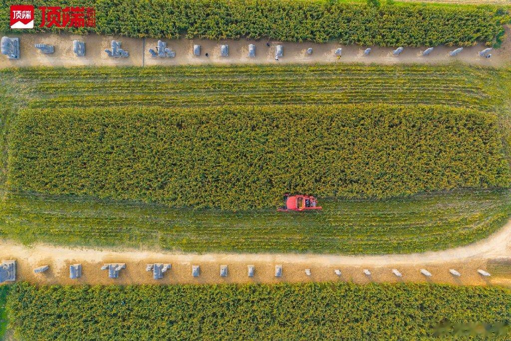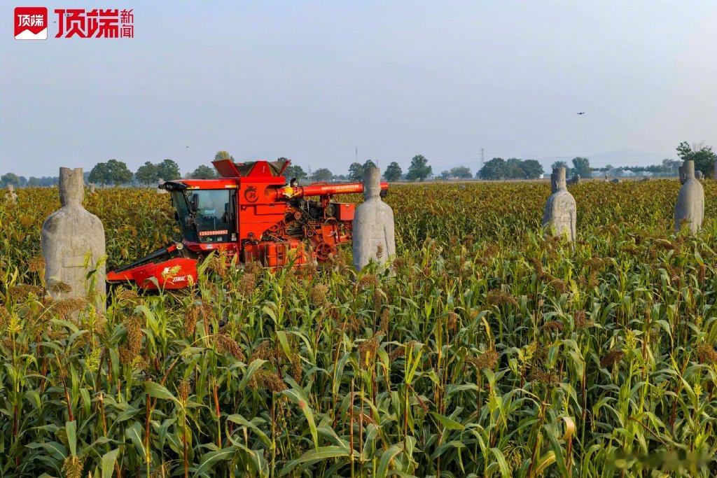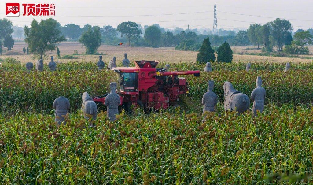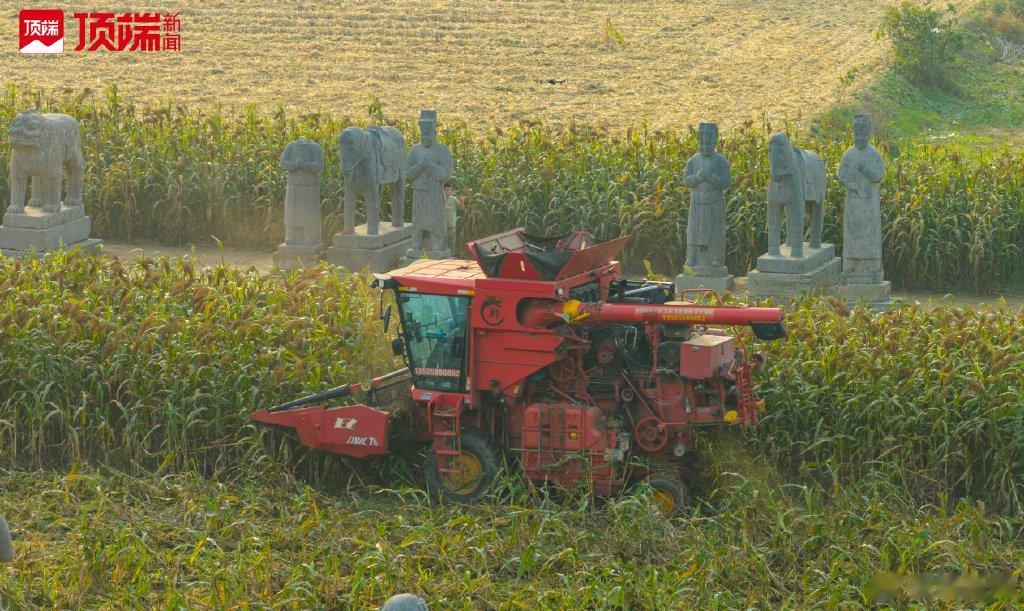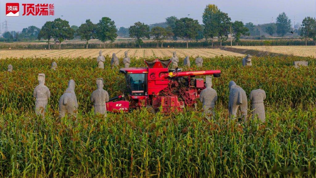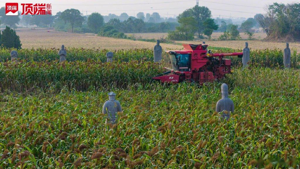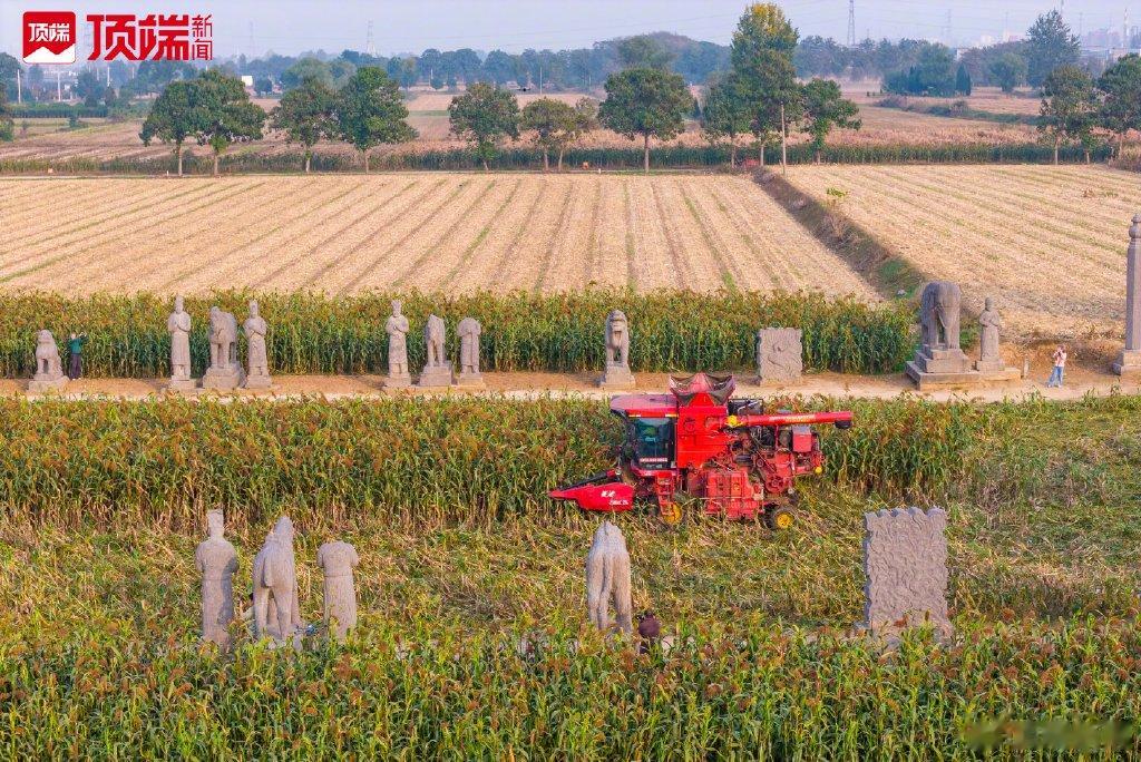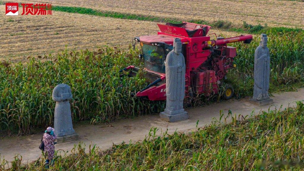收割机的钢铁巨臂与北宋文武官石像仅一垄之隔。一边是精准高效的现代科技,一边是承载着千年记忆的历史遗存,两者在同一画面中形成了震撼人心的对比。