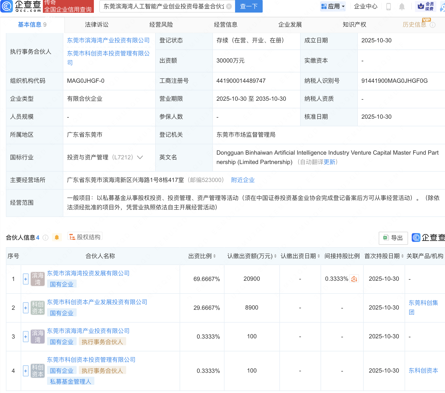 企查查APP显示,近日,东莞滨海湾人工智能产业创业投资母基金合伙企业(有限合伙)成立,出资额3亿元,经营范围包含:以私募基金从事股权投资、投资管理、资产管理等活动。企查查股权穿透显示,该公司由东莞市滨海湾投资发展有限公司等共同出资。