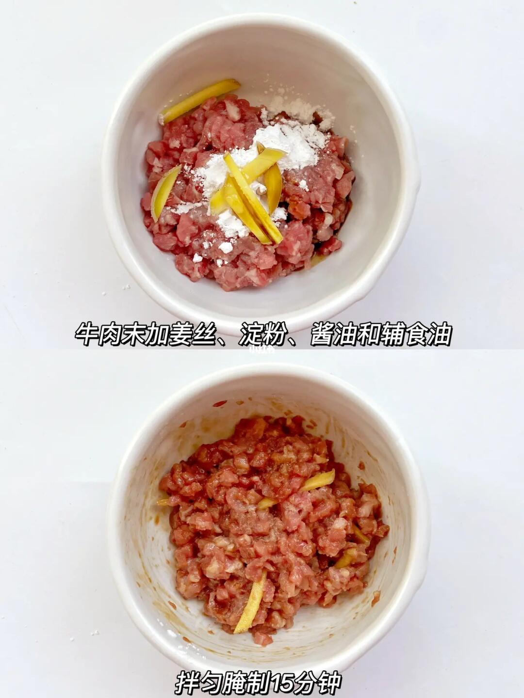 1⃣️牛肉加姜丝、淀粉、酱油和辅食油拌匀腌制15分钟。蔬菜全部焯水后,青菜切碎末。