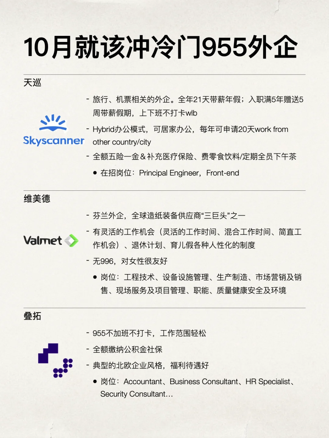 金九银十跳槽季,其实非常推荐大家去试试冷门一点的外企,才是真正的955工作制不卷不内耗 . 外企福利绝不止955,还有这些 ✅年假15天起步,病假也大方,弹性工作不打卡,居家办公灵活自由,六险一金足额缴,补充医保/补充商业保险,保障齐全,氛围轻松,女性友好,WLB拉满 . 坚持日更✊🏻,帮大家在找工作路上顺利拿到offer! .