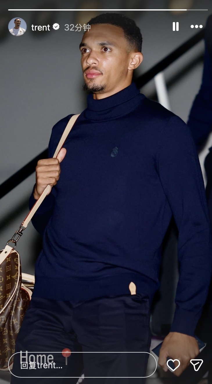 直播吧11月4日讯皇马将在本轮欧冠小组赛中客场对阵利物浦,皇马右后卫阿诺德在个人INS上晒照,抵达利物浦。