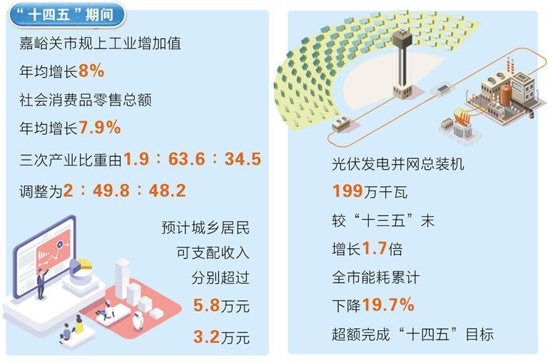 “十四五”期间,嘉峪关市规上工业增加值年均增长8%,社会消费品零售总额年均增长7.9%,三次产业比重由1.9∶63.6∶34.5调整为2∶49.8∶48.2,经济结构持续优化,呈现主导产业聚链成势、新兴产业势头良好、文旅融合生机蓬勃、科技创新动能增强、改革开放活力迸发等特点。