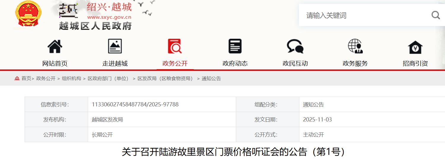 近日,绍兴市越城区人民政府发布《关于召开陆游故里景区门票价格听证会的公告(第1号)》: