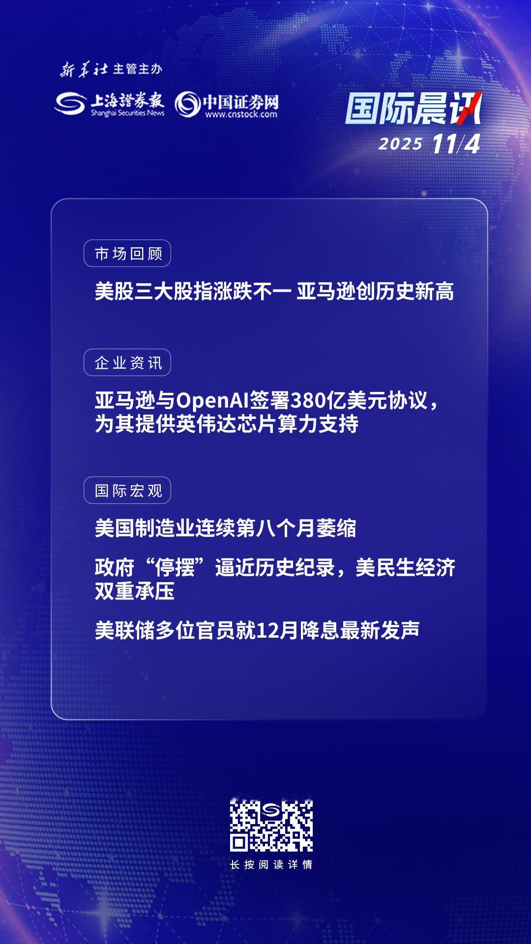 当地时间周一,美股三大股指涨跌不一。截至收盘,道琼斯指数跌0.48%报47336.68点,标普500指数涨0.17%报6851.97点,纳斯达克综合指数涨0.46%报23834.72点,逼近记录高位。科技巨头表现强势,其中亚马逊涨4%创历史新高,英伟达涨超2%。