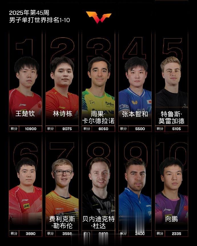 男单世界前10分别为:王楚钦排名第一,林诗栋排名第二,雨果排名第三,张本智和排名第四,莫雷加德排名第五,梁靖崑排名第六,小勒布伦排名第七,杜达排名第八,达科第九,向鹏第十。