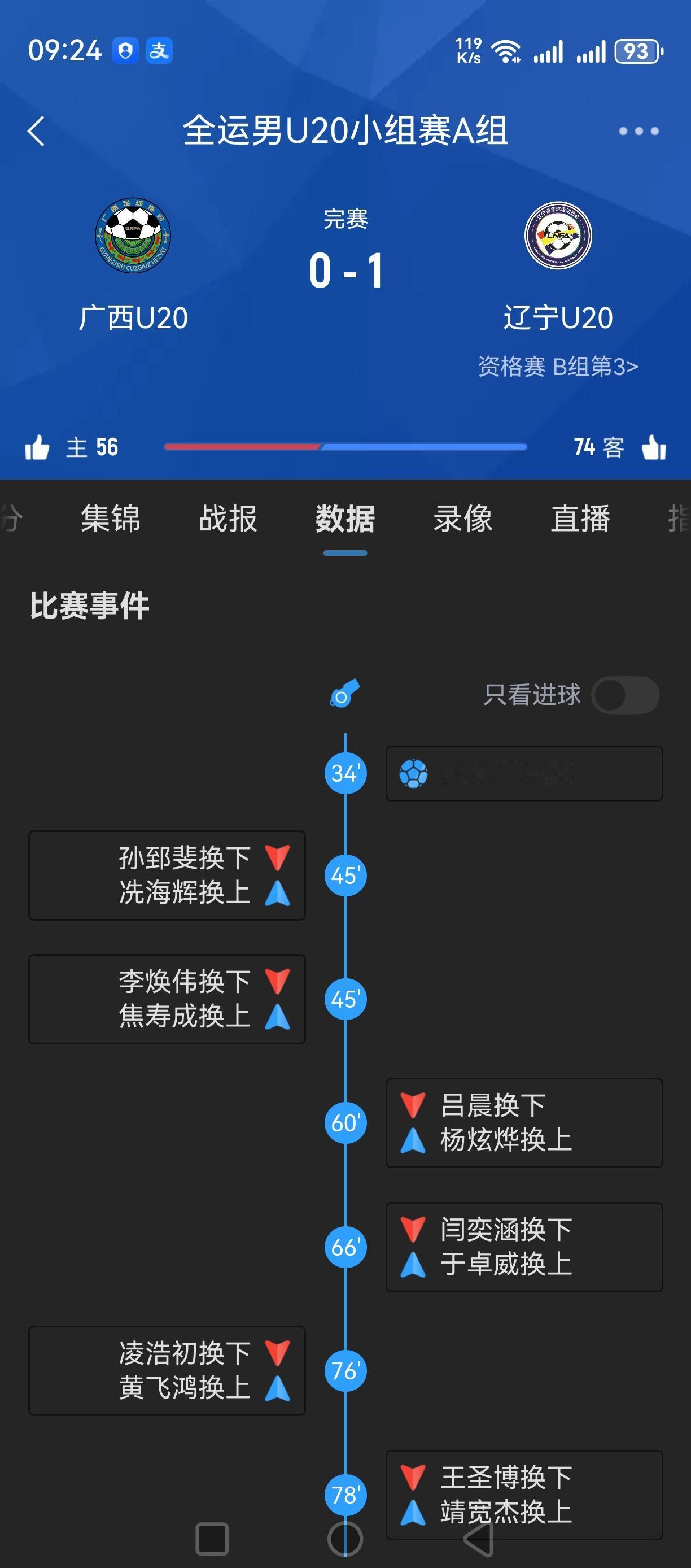 有点心凉!昨晚看了一场全运U20足球比赛,辽宁1:0胜广西。 双方的比赛,激烈有余,技术含量不足。全场除了朱鹏宇那个非常规动作,反踢毽子式入球,是个亮点外,其他真的看得让人昏昏欲睡。 广西就是后场开大脚找前锋,而辽宁在广西队的粗野拼抢下,技术也发挥不出来,失误频频。 这比赛技术含量太低了,关键还是U20,中国后备足球人才的展示,这水准,这教练急功近利的战术安排,看得让人有点心凉。