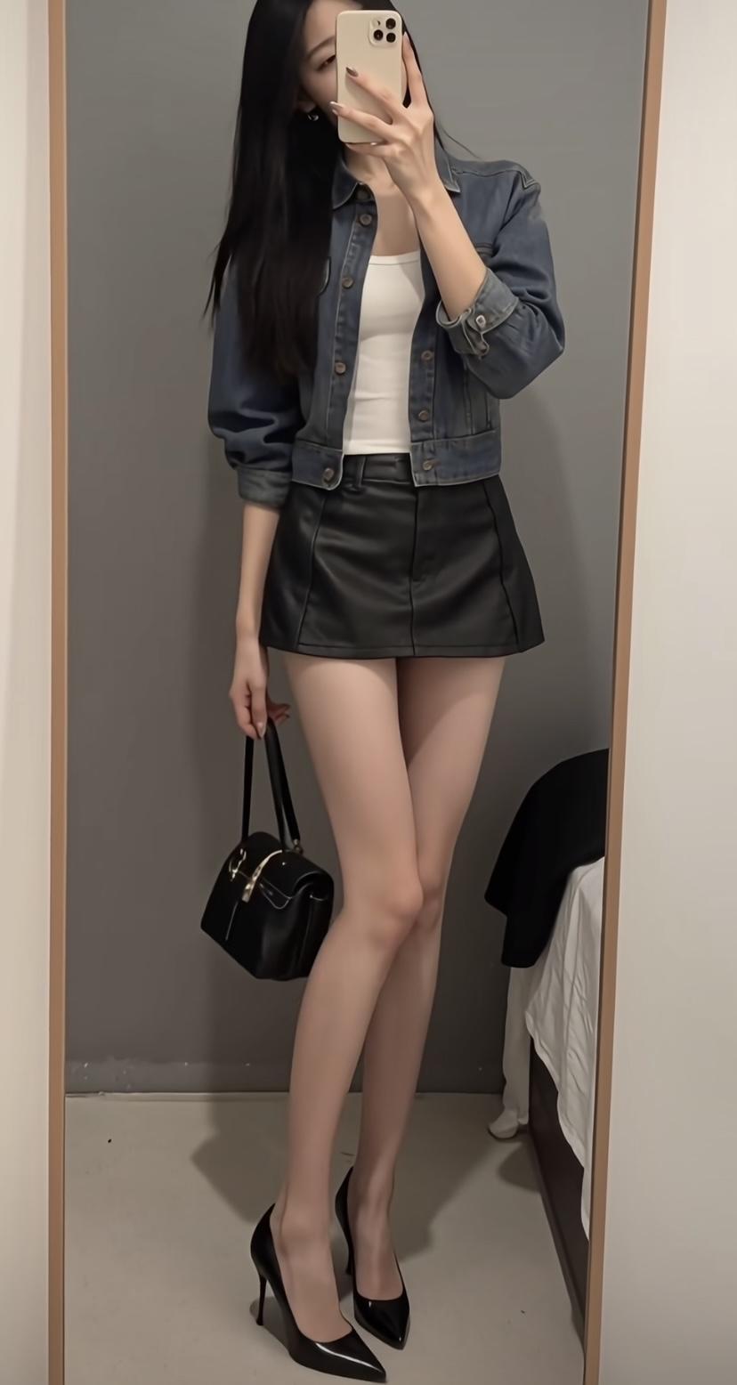 牛仔外套+皮裙,搭配黑色高跟鞋,简约又帅气!
