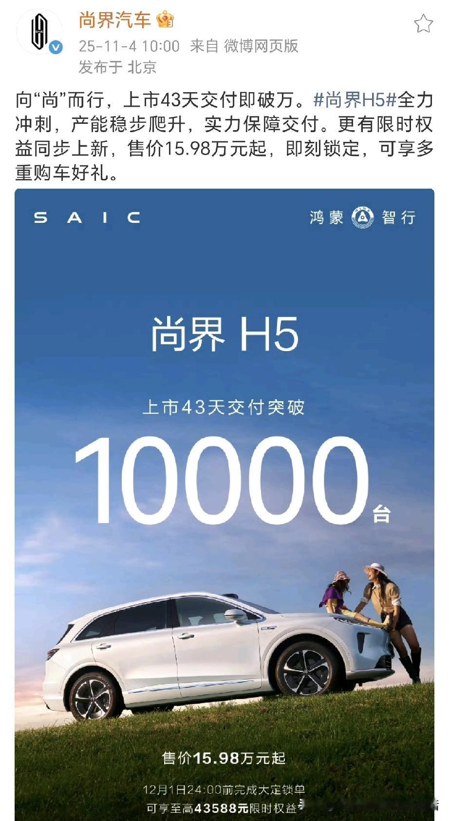 黑子们可以闭嘴了! 尚界汽车贾总不藏了,不再低调,突然发文,尚界H5上市43天交付破万!不是小订,也不是大定,直接是交付, 自从鸿蒙智行和赛力斯公布10月的销量数据后,全网都在猜尚界的销量,贾总也不再藏着,高调公布交付数据,43天交付破万,啪啪打脸了吧! 全体沉默了,万万没想到,尚界H5也已经过万辆!最不看好你,偏偏你最争气! 9月尚界H5上市的时候,贾总说尚界H5有GL8的舒适,桑塔纳的素质,华为的智能和余承东的要求。除了提供与鸿蒙智行一致的服务保障外在三电系统,我们还会提供首任车主终身质保。 尚界H5不到20万就拥有了高端的所有的配置,看来群众的眼睛是雪亮的,车好不好,H5车主心里跟明镜似的。这一万车主告诉你H5是远超同级的好车! 你们觉得呢?