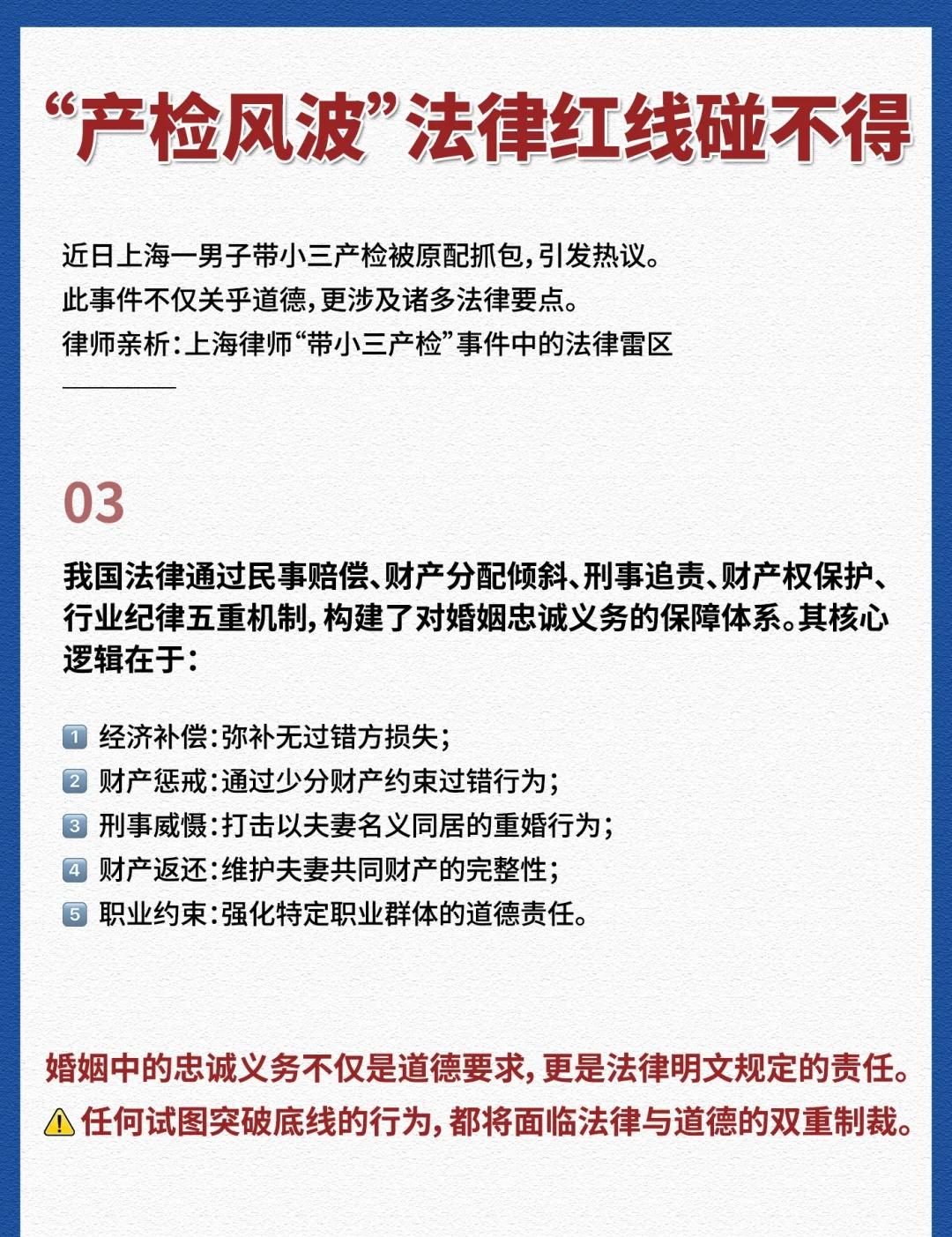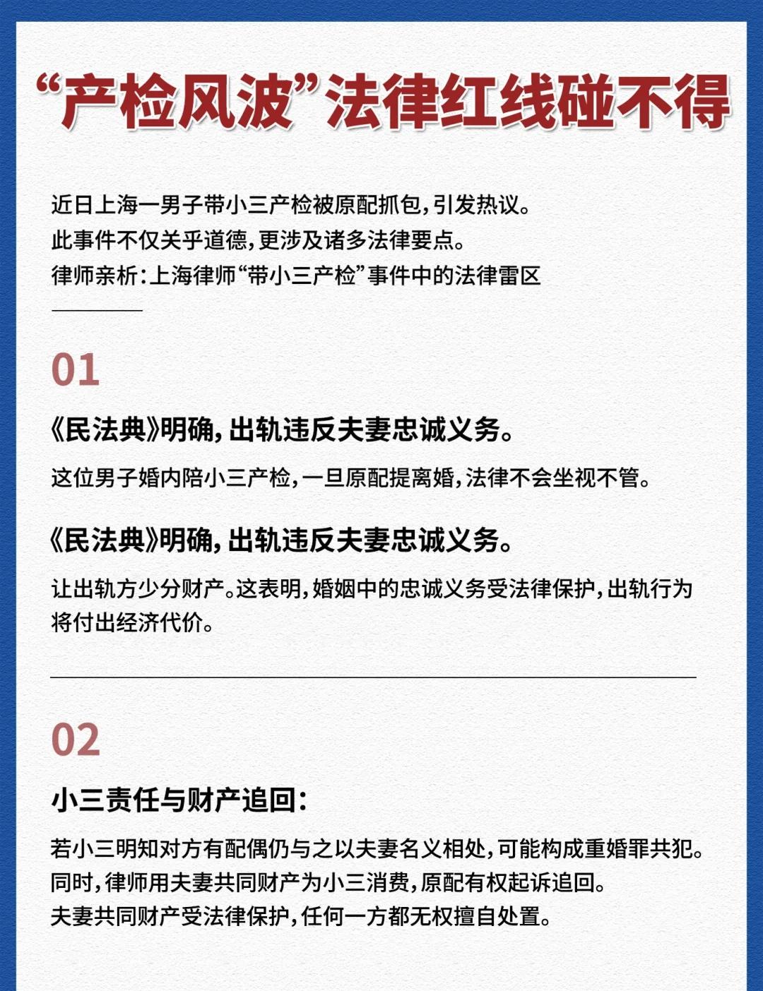 “产检风波”:法律红线碰不得❌ - 近日上海一男子带小三产检被原配抓包,引发热议。 此事件不仅关乎道德,更涉及诸多法律要点。 -律师亲析:上海律师“带小三产检”事件中的法律雷区 - ✅《民法典》明确,出轨违反夫妻忠诚义务。 这位男子婚内陪小三产检,一旦原配提离婚,法律不会坐视不管。 ✅原配有权要求“损害赔偿”,而且在财产分割时,法院会考虑过错因素, 让出轨方少分财产。这表明,婚姻中的忠诚义务受法律保护,出轨行为将付出经济代价。 - 💡小三责任与财产追回: 若小三明知对方有配偶仍与之以夫妻名义相处,可能构成重婚罪共犯。 同时,律师用夫妻共同财产为小三消费,原配有权起诉追回。 夫妻共同财产受法律保护,任何一方都无权擅自处置。 - 📖我国法律通过民事赔偿、财产分配倾斜、刑事追责、财产权保护、行业纪律五重机制,构建了对婚姻忠诚义务的保障体系。其核心逻辑在于: 1️⃣经济补偿:弥补无过错方损失; 2️⃣财产惩戒:通过少分财产约束过错行为; 3️⃣刑事威慑:打击以夫妻名义同居的重婚行为; 4️⃣财产返还:维护夫妻共同财产的完整性; 5️⃣职业约束:强化特定职业群体的道德责任。 婚姻中的忠诚义务不仅是道德要求,更是法律明文规定的责任。 ⚠任何试图突破底线的行为,都将面临法律与道德的双重制裁。 - 法律咨询 婚姻家庭 法律常识 维权指南男律师出轨 第三者停车场 小三 小三门