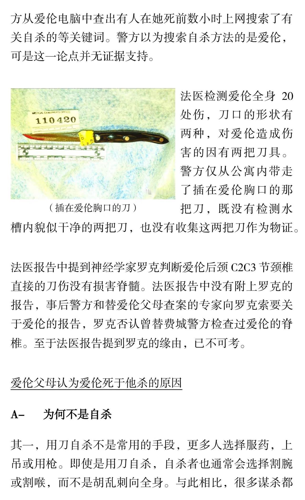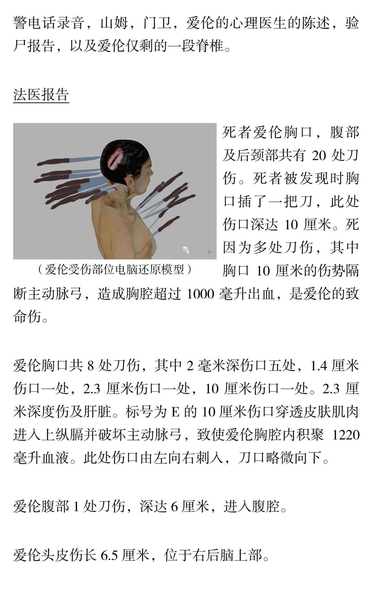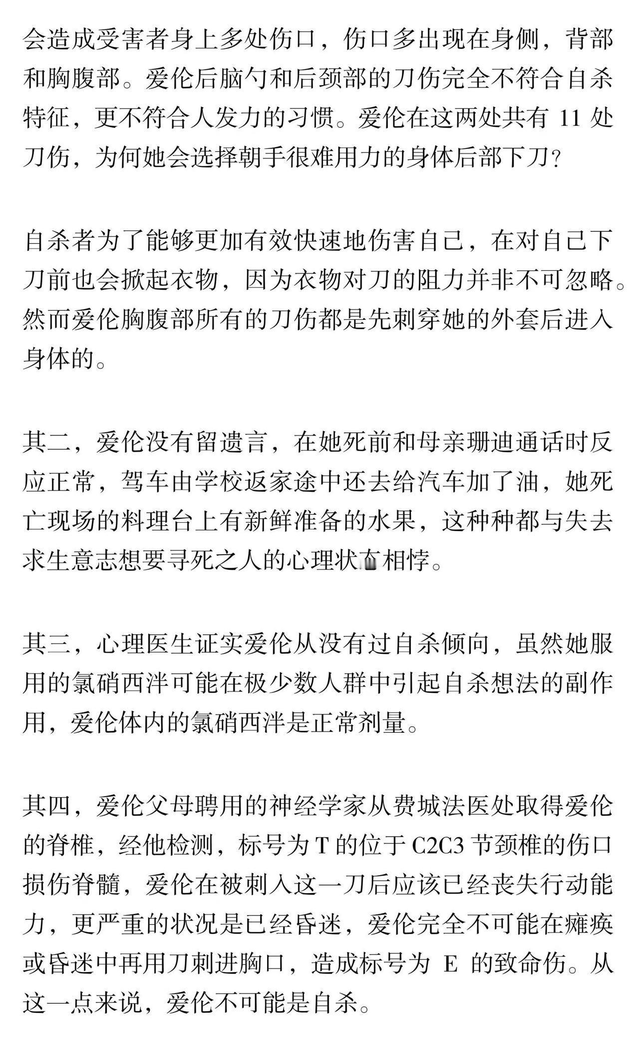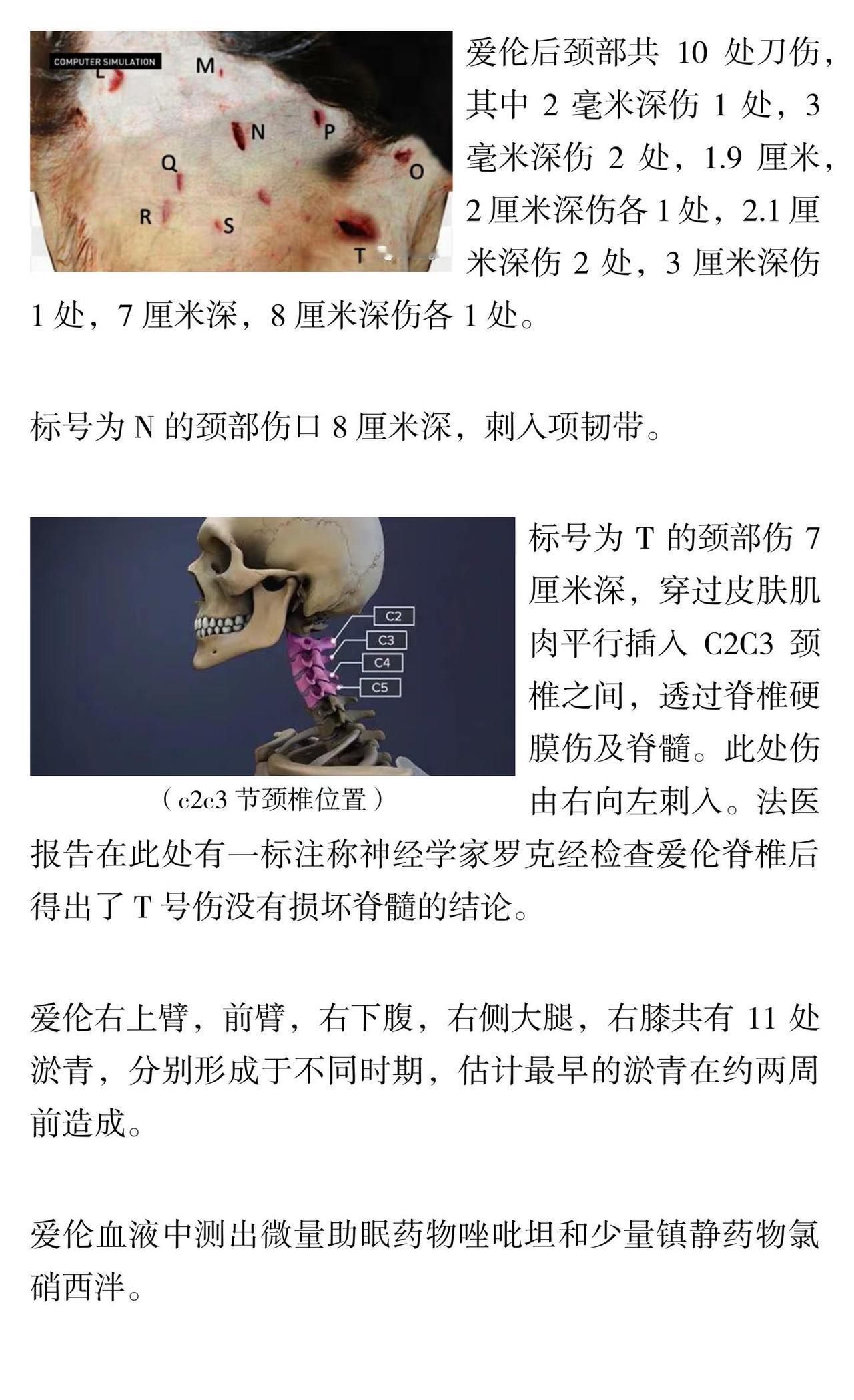 不可能完成的自杀 标号为T的位于C2C3节颈椎的伤口损伤脊髓,爱伦在被刺入这一刀后应该已经丧失行动能力,更严重的状况是已经昏迷,爱伦完全不可能在瘫痪或昏迷中再用刀刺进胸口,造成标号为E的致命伤。