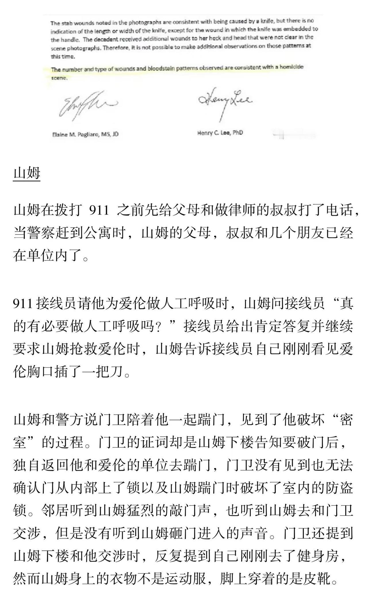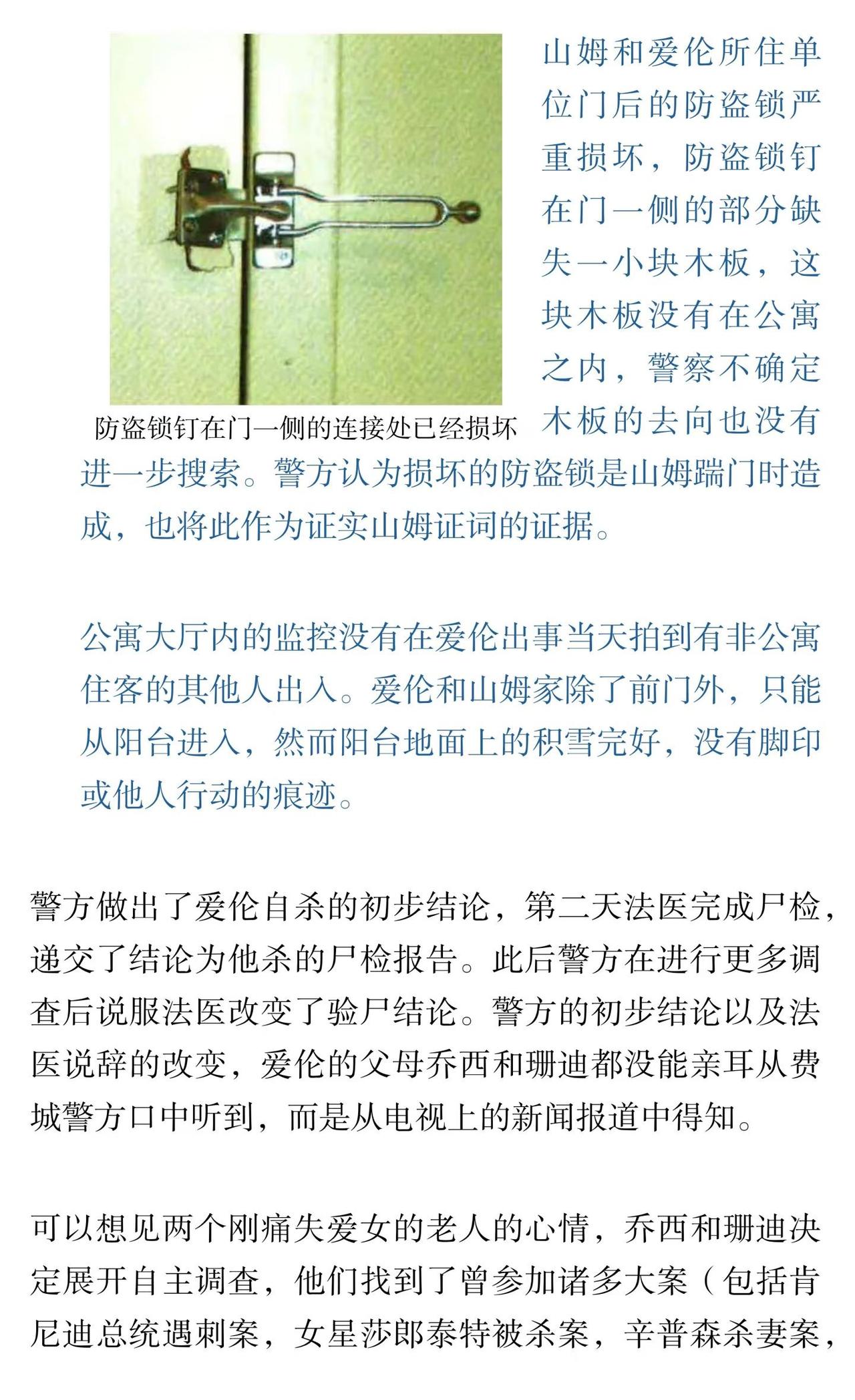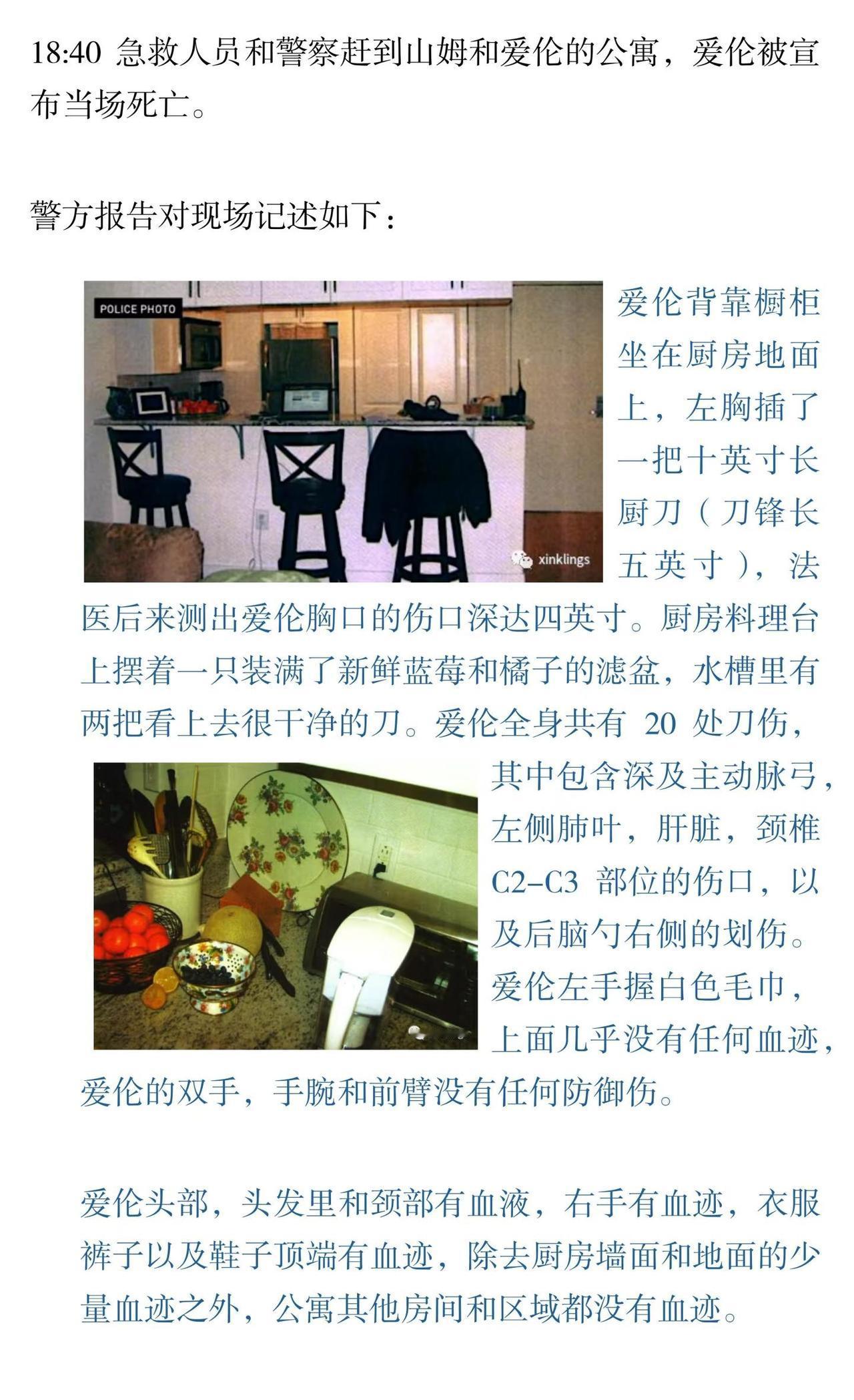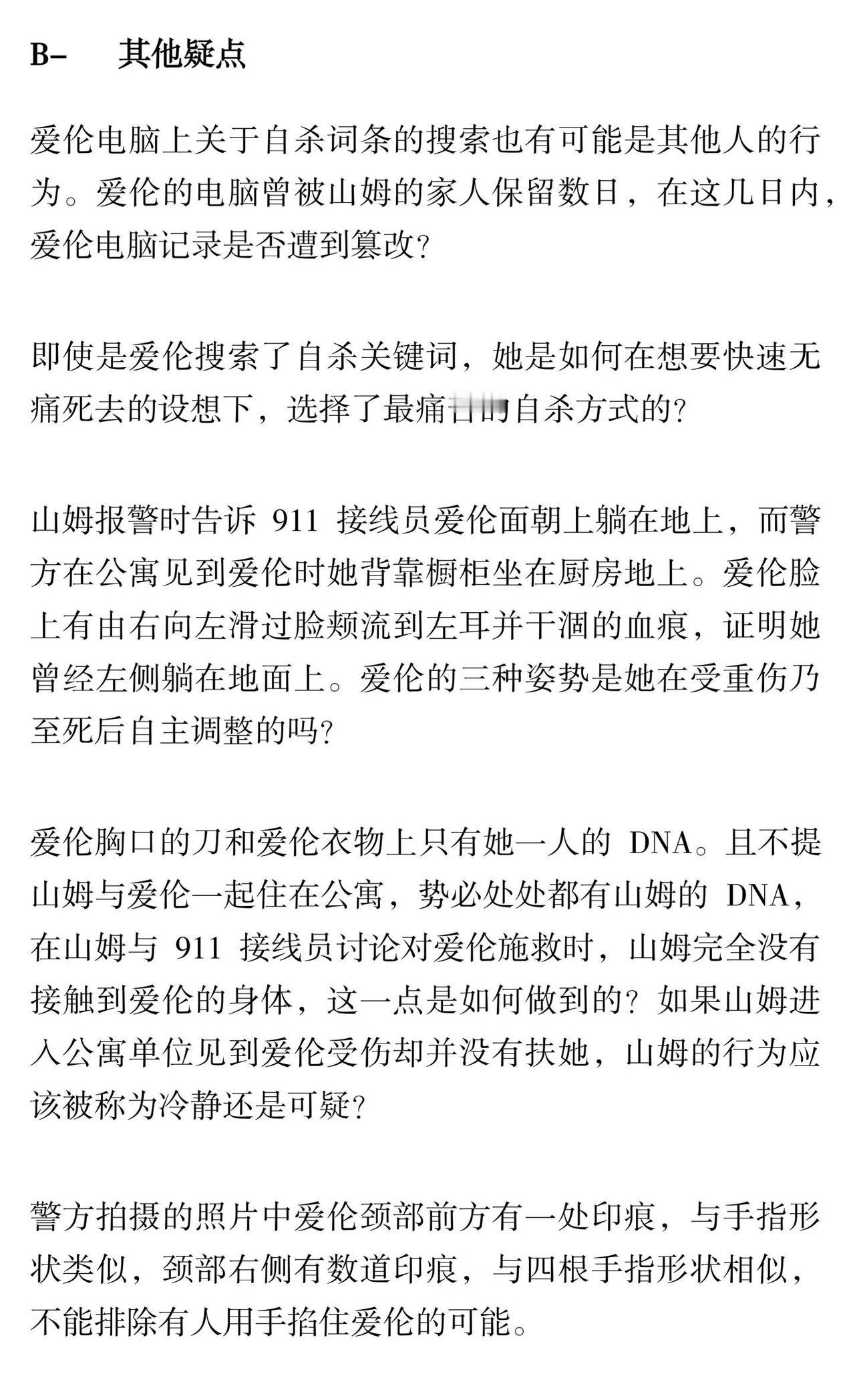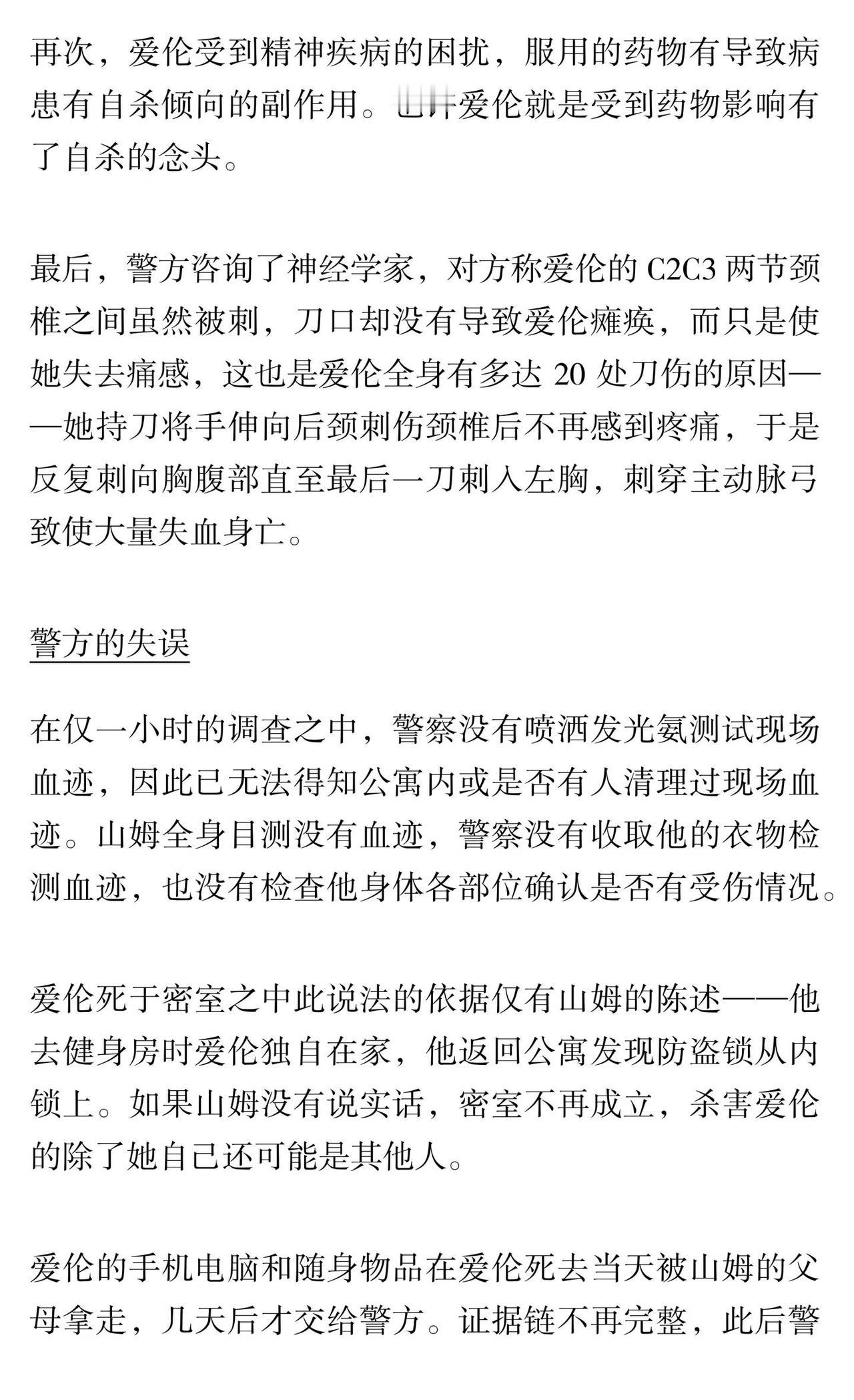 不可能完成的自杀 标号为T的位于C2C3节颈椎的伤口损伤脊髓,爱伦在被刺入这一刀后应该已经丧失行动能力,更严重的状况是已经昏迷,爱伦完全不可能在瘫痪或昏迷中再用刀刺进胸口,造成标号为E的致命伤。