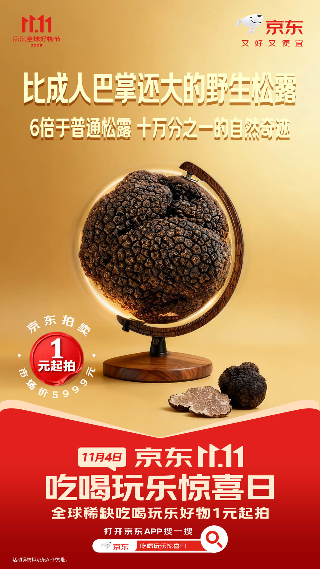 有些东西的价值不在价格,在稀有。比如京东拍卖这个直径12厘米的野生黑松露,十万分之一的概率,是大自然“盖了章”的珍品,钱都买不来这份运气。好吃的好喝的好玩的都在京东11.11吃喝玩乐惊喜日!11月4日,打开京东APP搜「吃喝玩乐惊喜日」 ,超市好物5折起!超多IP联名好物1元开秒,还能抽百万份免单!京东惊喜日惊喜不断,记得持续关注哦~ 京东拍卖巴掌大野生黑松露京东吃喝玩乐惊喜日超市好物5折起京东11.11 又好又便宜京东11.11吃喝玩乐惊喜日