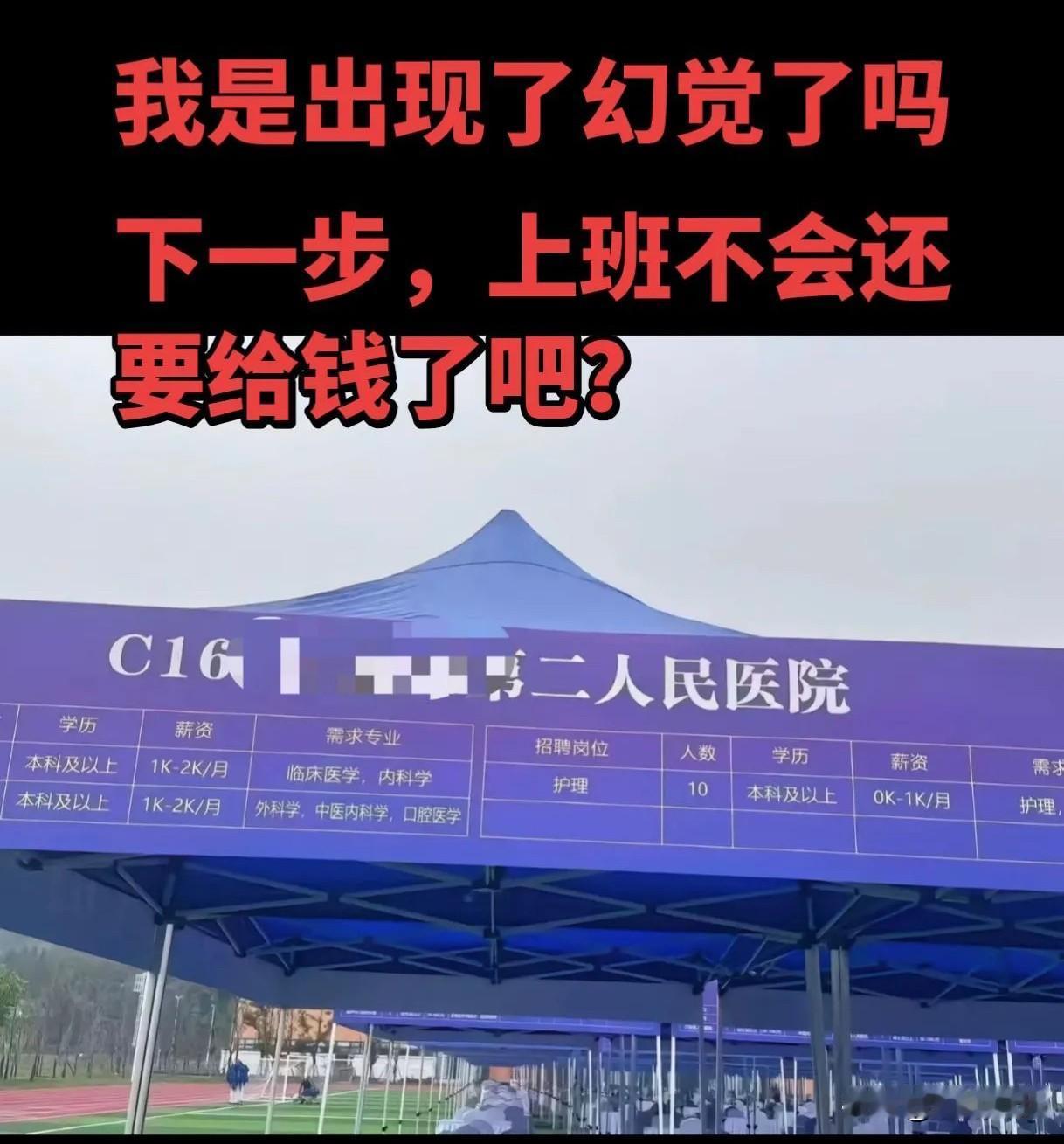 “土木死于 2019,临床死于 2025”这句话的含金量还在上升!近日有某人民医院校园招聘会信息显示,本科以上临床医学,内科学,外科学,中医内科学和口腔医学等专业薪资 1k-2k/月;护理专业更是薪资为 0k-1k,这也许是招的规培生,但是这相比于学习这些专业的付出接近于零的薪资待遇多少让人唏嘘不已,现在包括医学生在内的各行各业怎么都这么不尽人意了呢?医学生就业选择 医学生就业现状 医学生就业真相 药学薪资 医学生岗位 医生就业困境 医学生就业困境 医学就业