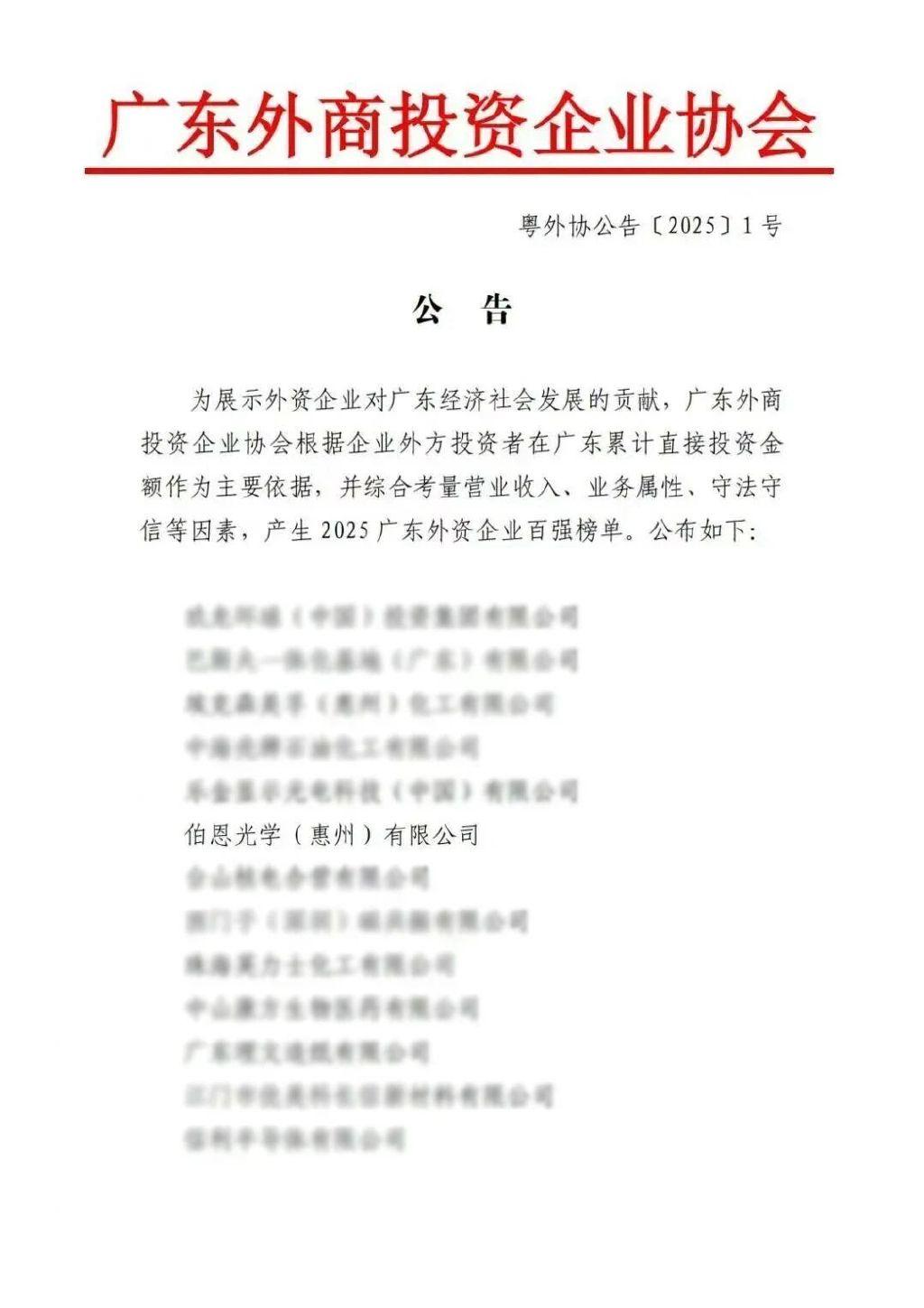 2025年10月30日,作为2025粤港澳大湾区全球招商大会的重要配套活动,广东外资企业百强榜单发布会在广州成功举行,其中伯恩光学连续两年上榜广东外资企业百强榜单。本次活动旨在生动展现优秀外资企业在广东的投资成果与发展风采,全面呈现广东持续优化的营商环境与对外开放成效,进一步增强外资企业在粤投资与长期发展的信心,助力广东构建高水平开放型经济新体制。