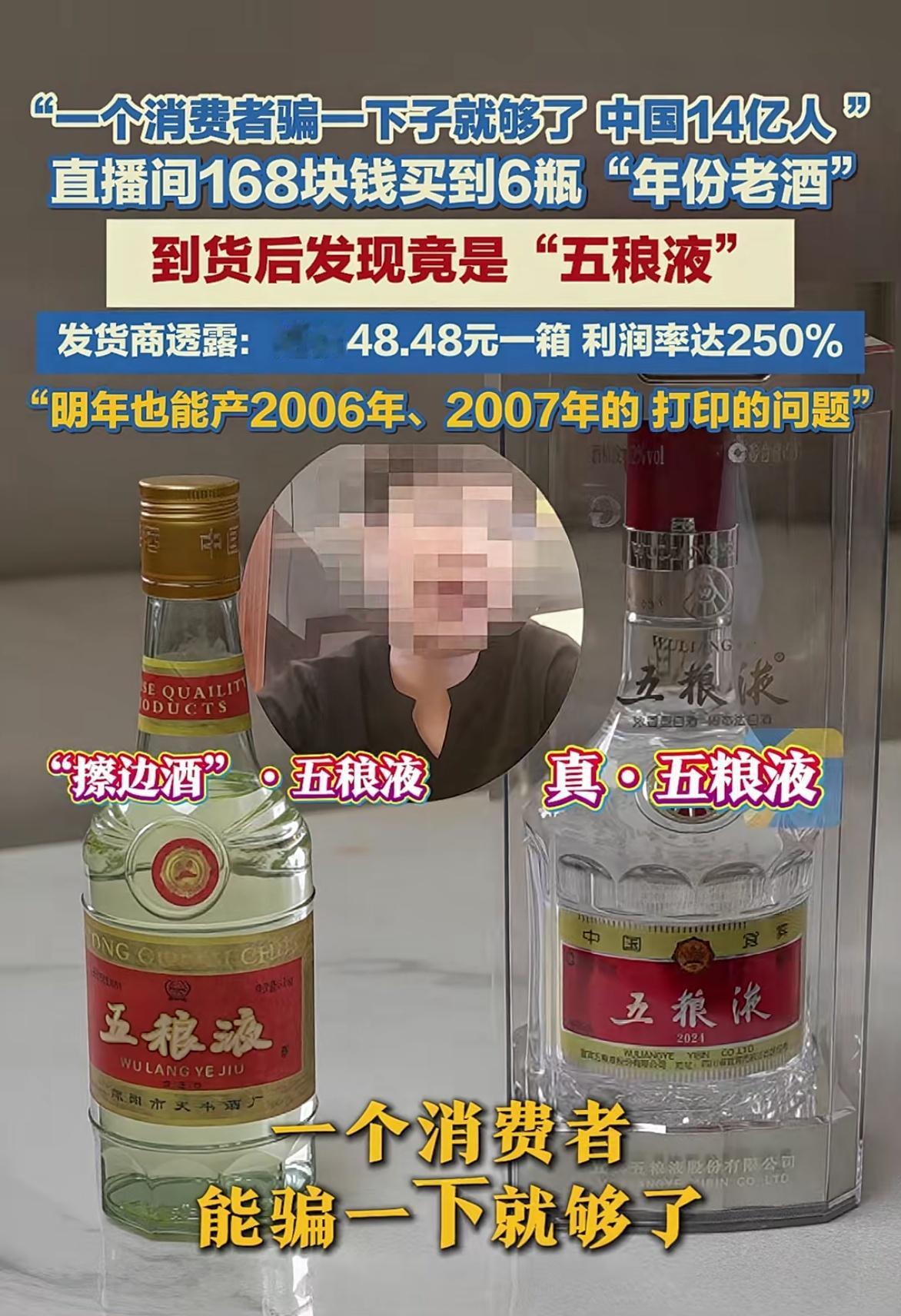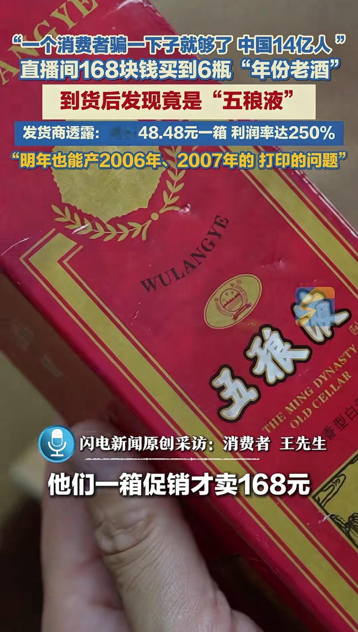 一箱“五粮液”只要168块钱?有消费者反应,在直播间抢的老年份“五粮液”酒到货竟然变成了“五稂液”,多个直播间售卖这个品牌的酒,还用“老五粮”“四川浓香酒水老大”等说辞介绍老酒,误导消费者。 记者暗访发货商,发货商说年份明年也可以产,只不过就是打印的问题,进价一箱也就48块钱,利润250%,还嚣张的说中国有14亿人,一人骗一次也就可以了。 现在短视频平台众多直播间都在售卖假酒,希望官方能对各个直播间严格审核。