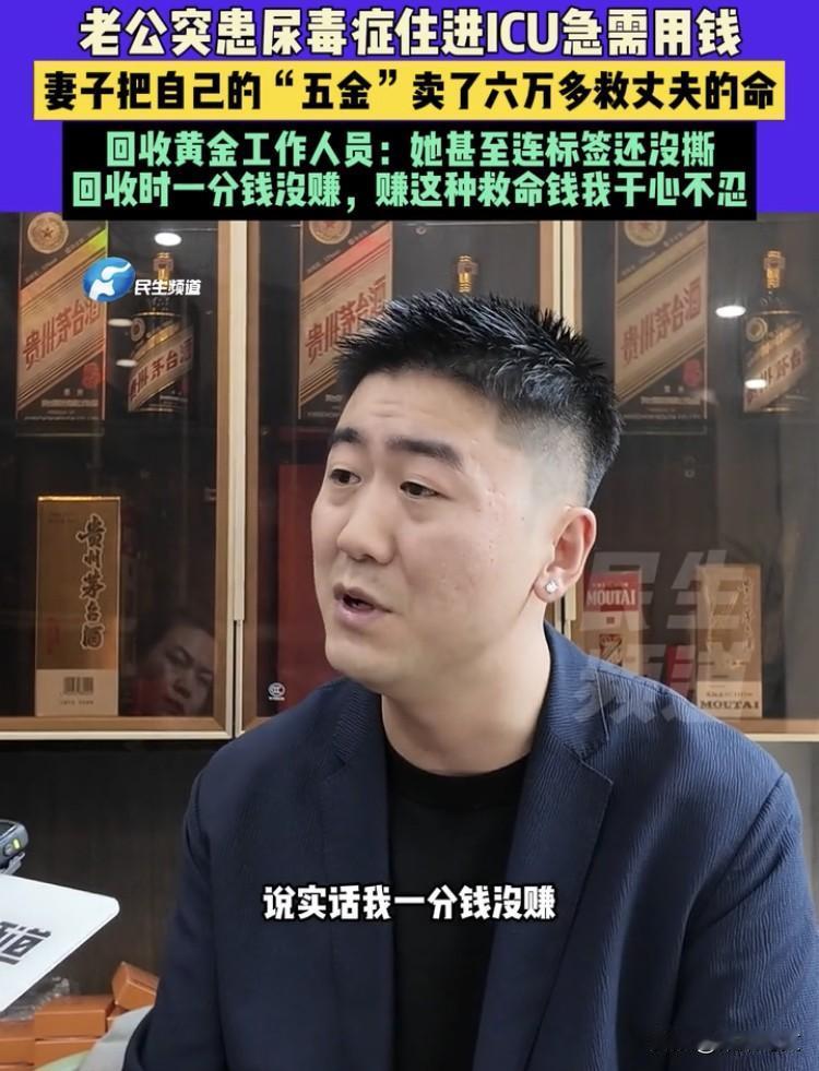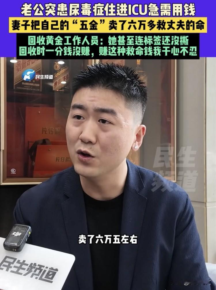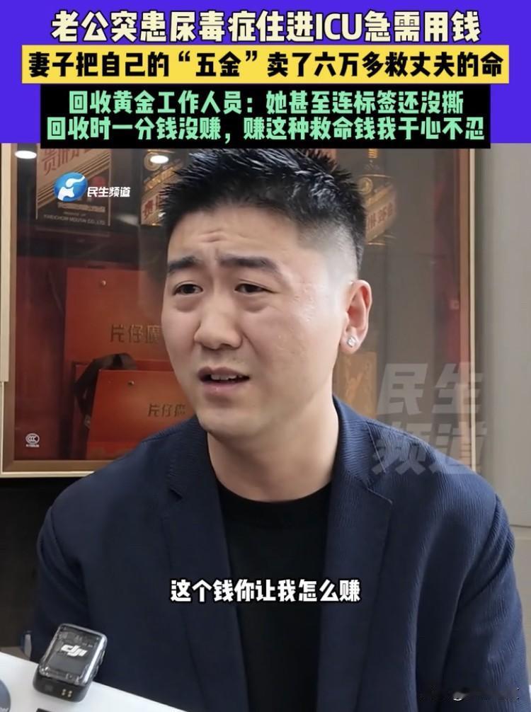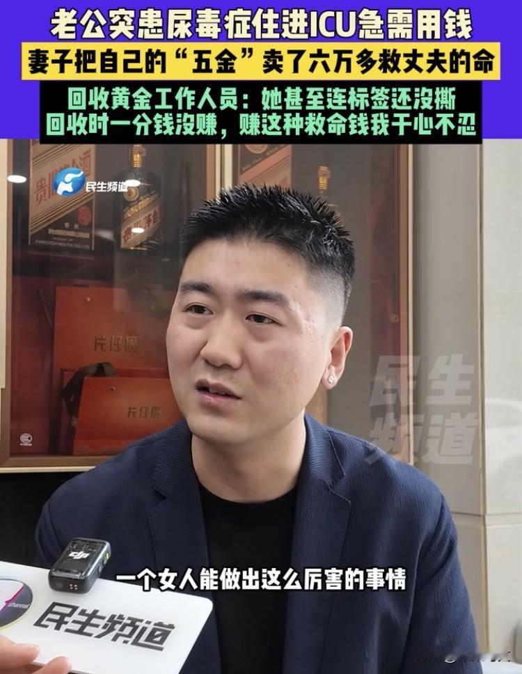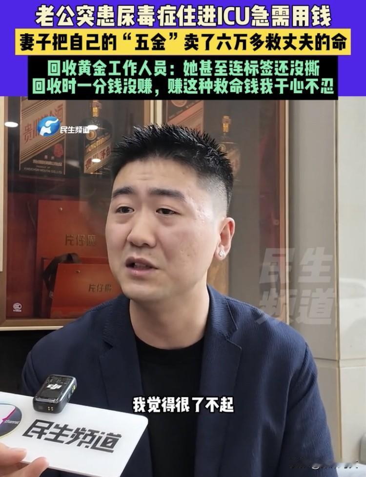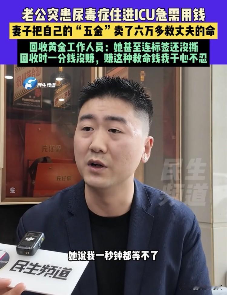 “该你当老板!”河南郑州,这天回收黄金的老板接待了一位女子。女子眼泛着泪光拿出标签都还没撕掉的首饰。老板却劝她:“先别卖,黄金还会涨!” 当天,女子拿着5件黄金首饰走进黄金回收店。老板接过她的黄金首饰,发现连标签都还撕掉,成色很新。 期间,老板跟女子唠嗑了一会才得知这些首饰是她结婚时的“五金”。 原来女子的老公生病了,患的是尿毒症,很突发,现在在ICU急需用一笔钱。没办法只能把“五金”卖了换钱。 女子说到老公的时候眼里泛着泪光,既心疼又着急,声音一度哽咽。 得知此事,老板也不由得心疼起这位女子,他好心劝道:“姐你先别卖了,黄金后期可能还会继续涨的!” 女子着急地说:“不行,我一刻也等不了,我必须要拿这笔钱去救我老公的命!” 老板说:“你要不跟亲戚朋友们张个口,先借点救救急?” 女子拒绝的很干脆:“我不想这样,这样会欠人情!” 最终,老板以6万5左右的价格收了这五件首饰。 就在前几天,老板受到了河南民生频道记者的采访。老板再次回想起这件事时,眼里满含惋惜。 他说:“说实话,她的黄金我一分钱没赚,毕竟谁都有落难的时候,这个钱你让我怎么赚呢,我于心不忍!” 老板不由得感叹:“大姐跟老公才结婚四五年,一个女人能做出这么厉害的事,我觉得很了不起。现在的年轻夫妻到底得有多深的感情,才能把五金拿去卖掉救老公,我真挺心疼这个大姐的!” 连标签都还没撕掉,可见女子还没佩戴过这些首饰,一直将这些宝贝珍藏着。 如今,面对丈夫患病,这些宝贝便成了救命的希望。女子毫不犹豫地将其变卖,可见她的用情至深。 而收黄金的老板选择分文不赚,可见其对生命的尊重和对他人的善意。 如果是无良老板,说不定会趁其着急用钱而坑一笔。 在这个快餐式的时代,总有人告诉我们“人间仍有真情”! 在危难时刻,真情和善意依然存在。当爱情遇上生死,才能看出另一半的深情和坚定。爱,比黄金珠宝要珍贵得多!