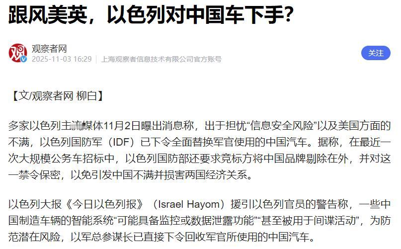 以色列议员窜台后,以军方又全面封杀中国汽车,还不许中方报复? 今年9月的时候,以色列未来党议员托波洛夫斯基,无视我方反对,非法窜访中国台湾省。这事当时闹得沸沸扬扬,一度给中以关系蒙上阴影。 这还不算完,11月2日,以色列国防军(IDF)又被爆出已下令全面替换军官使用的中国汽车。其给出的理由也颇为牵强,一方面声称出于对“信息安全风险”的担忧,另一方面则提及美国方面的不满。 更让人难以接受的是,以色列方面还大言不惭地表示,中国制造车辆的智能系统“可能具备监控或数据泄露功能”,甚至妄称“可能被用于间谍活动”。 以色列的这番表态可以说是无耻至极,论及“监控”“间谍活动”,以色列才是真正的行家里手,其情报机构摩萨德更是以手段隐秘、行事大胆著称。 远的不说,就拿伊朗核问题来说,多年来摩萨德多次针对伊朗核科学家和核设施展开行动,2020年更是策划实施了对伊朗顶级核科学家法克里扎德的暗杀,这类充满恶意的情报活动早已是公开的秘密。 而在欧洲,以色列也曾被曝出利用“飞马”间谍软件对多国政要、记者和普通民众进行监控,涉及法国、阿联酋等多个国家,甚至连美国前国务卿希拉里的助手都曾被列入监控名单。 以色列在情报领域的“战绩”全球闻名,如今却倒打一耙指责中国,这简直是典型的“人不会想象自己没做过的事情”。 中国汽车产业近年来在智能网联领域的发展有目共睹,也始终严格遵守各国法律法规,注重用户数据安全和隐私保护,从未有过任何所谓“监控”、“间谍”的行为记录,以色列的指控纯粹是无稽之谈。 本来中美之间的贸易博弈是两国之间的事情,与以色列并无直接关联,以色列完全没必要主动蹚这趟浑水。但从其行动来看,显然是有意讨好美国,甘愿充当美国遏制中国发展的马前卒。 这种为了迎合第三方而损害与中国正常经贸合作关系的做法,既不理智也不明智。 以色列既然做出了这种不合理的决定,就应该清楚地认识到,我方完全有权利采取相应的反制措施。后续无论我们采取何种反制手段,都是以色列咎由自取,最好不要求饶!
