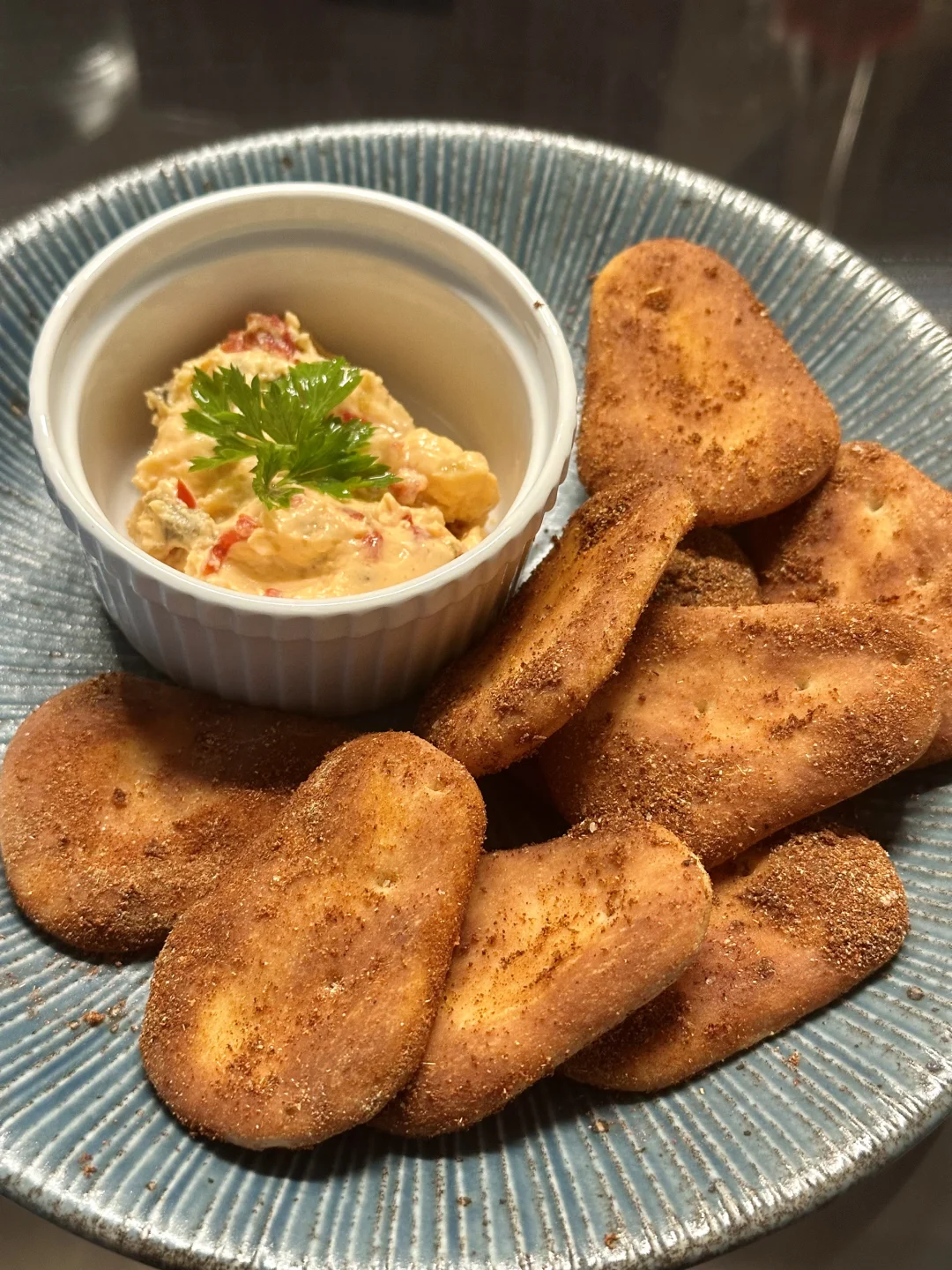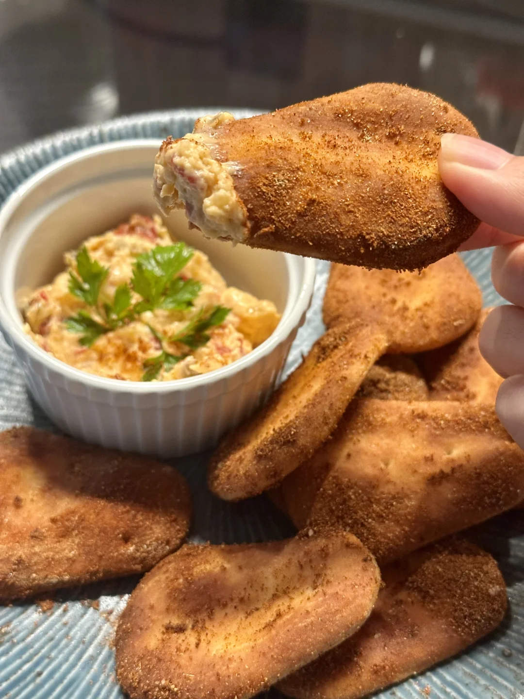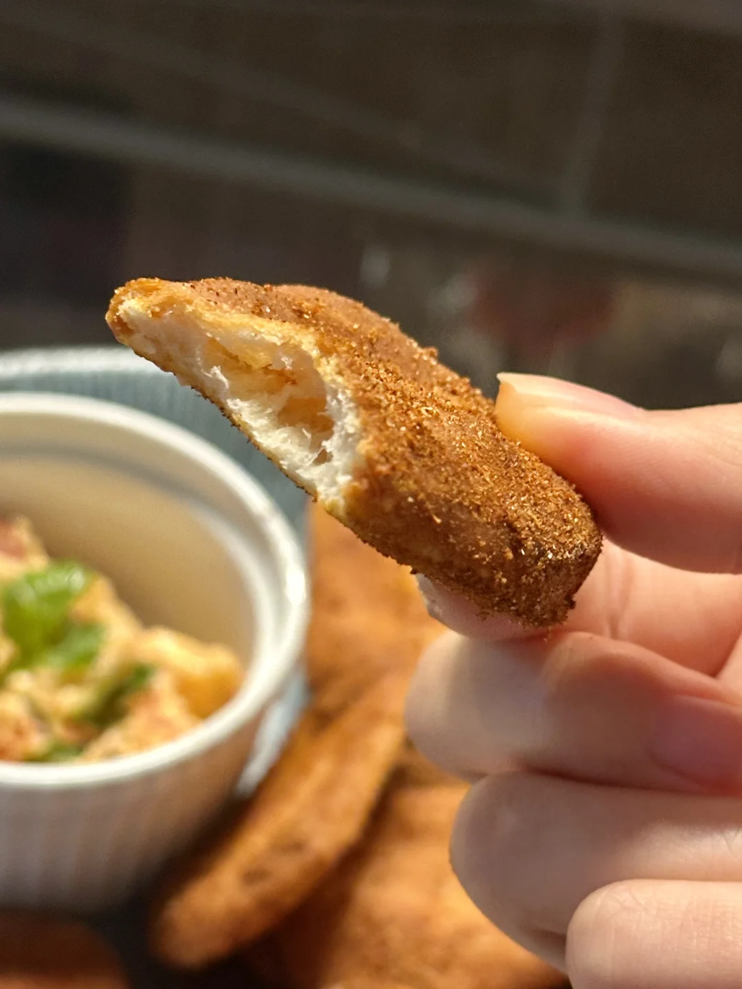 Cava的选品比一般Pita更厚实,所以在炸到表面酥脆后,内部依然是软软韧啾啾的。所以相对用市面上的皮塔饼,其实用这款小馕更接近(这馕直接吃也蛮香甜的哈哈)。